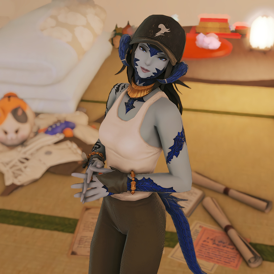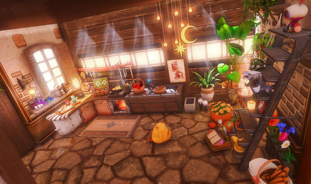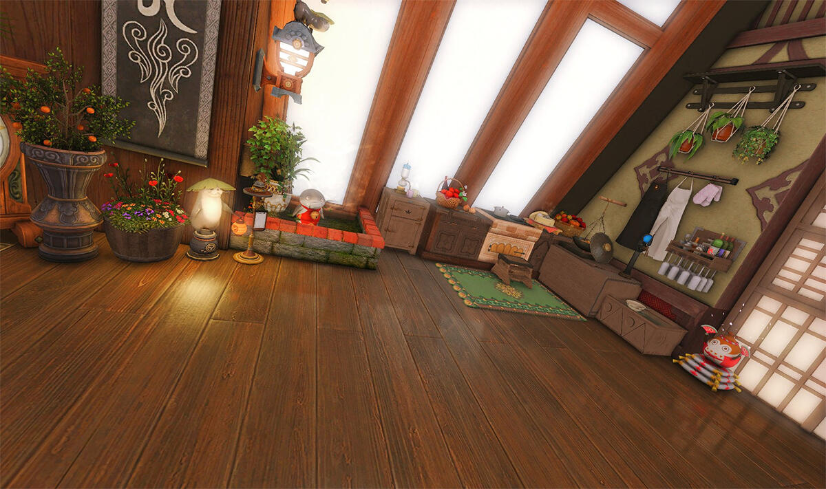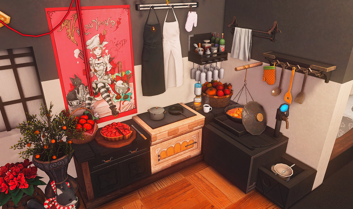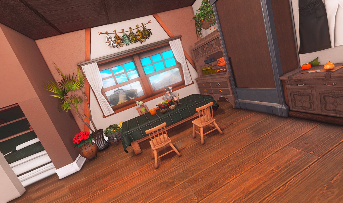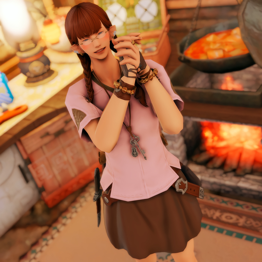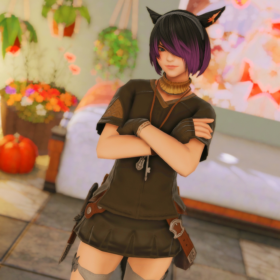 Nestled in the midst of a cozy fc in the mist lies a tiny rustic hut where a little cat girl lives. Singing as she cooks for her friends and guests, the cottagecore vibes are accented with the little 'squeak squeak' sounds from the feet of many a pet namazu that reside here.