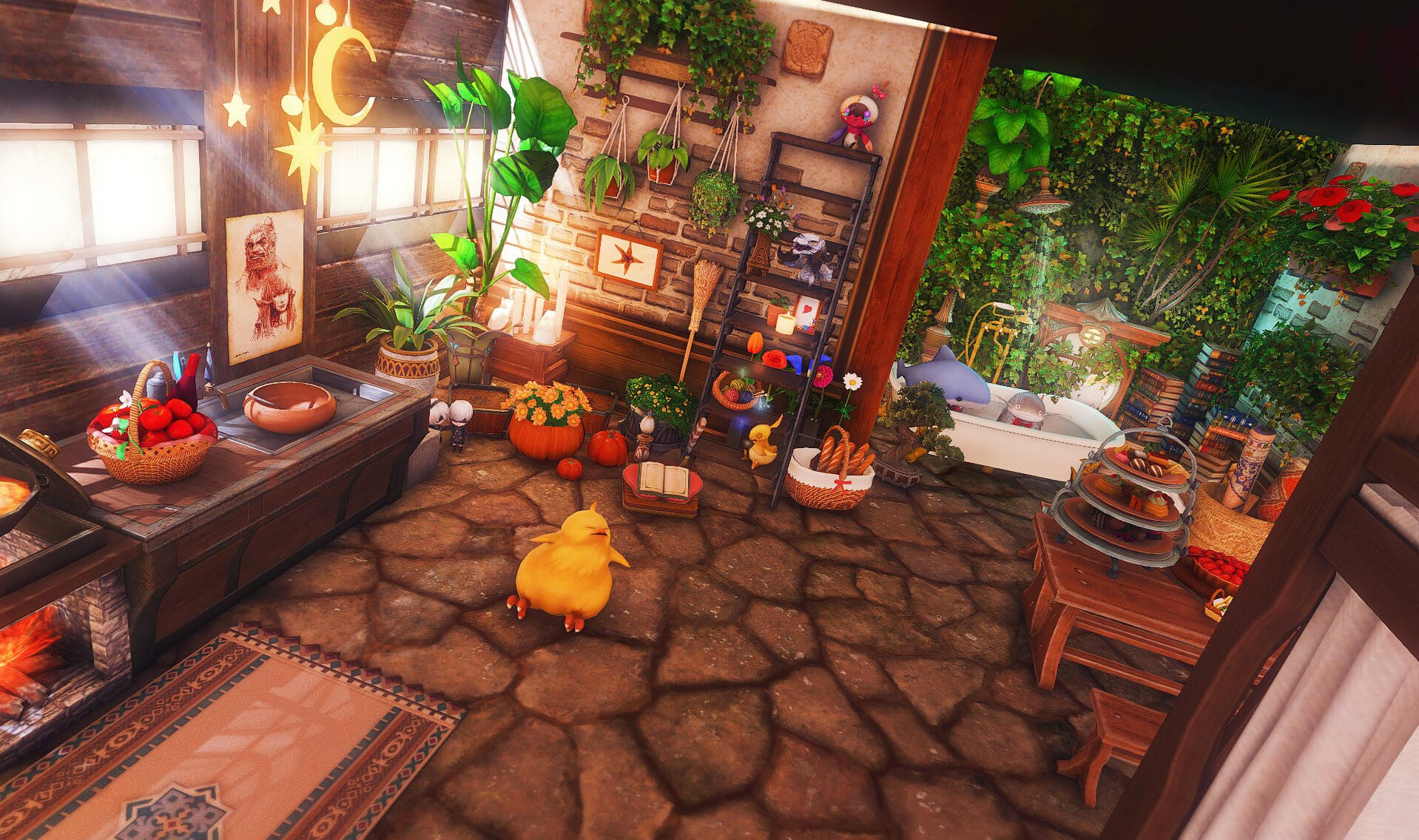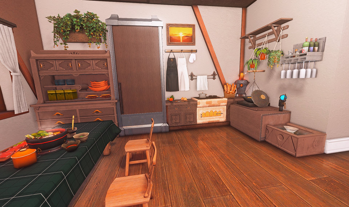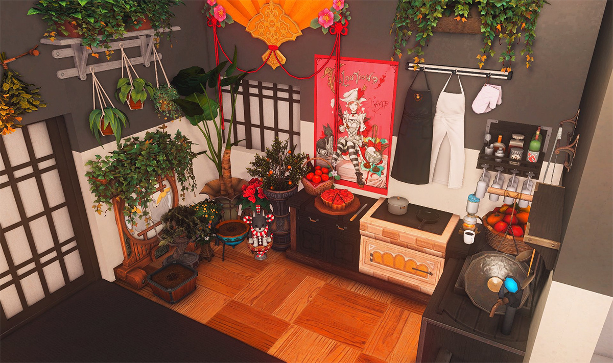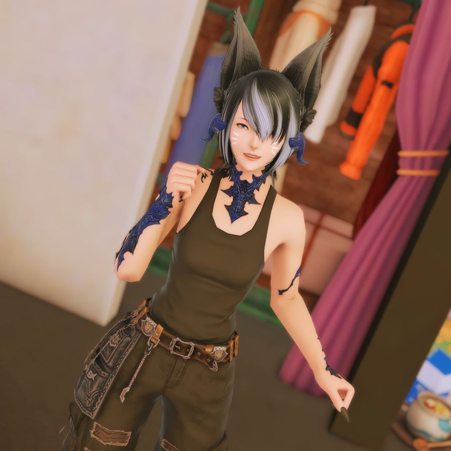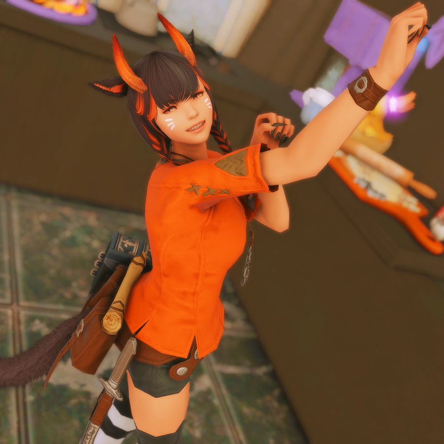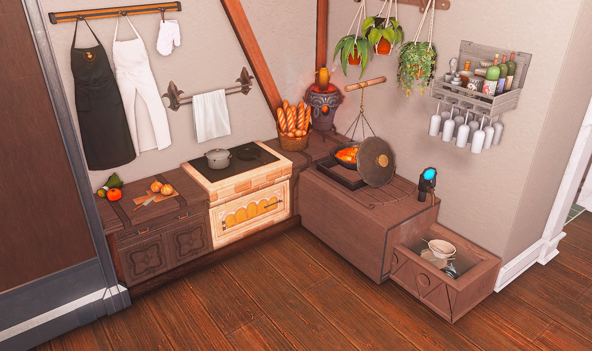 Nestled in the midst of a cozy fc in the mist lies a tiny rustic hut where a little cat girl lives. Singing as she cooks for her friends and guests, the cottagecore vibes are accented with the little 'squeak squeak' sounds from the feet of many a pet namazu that reside here.