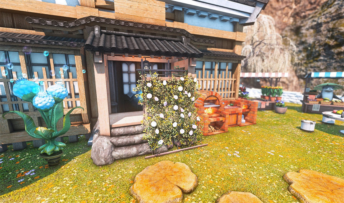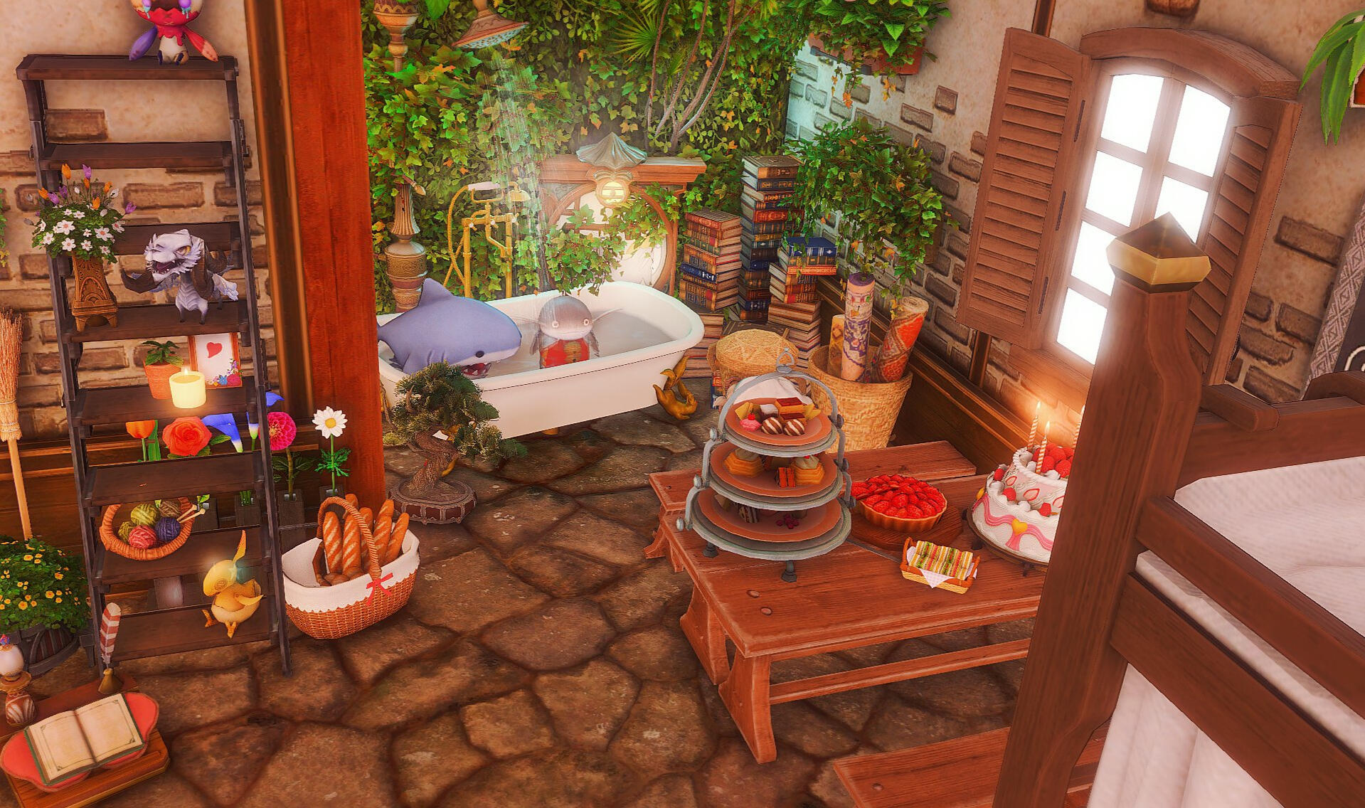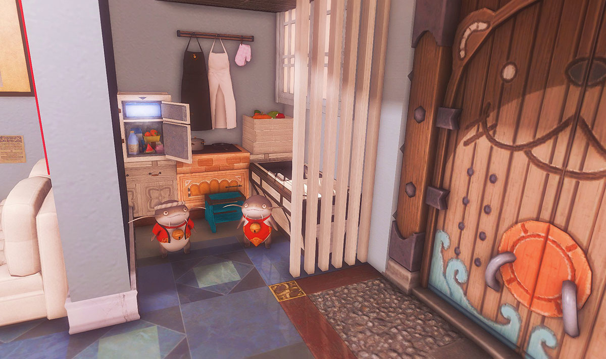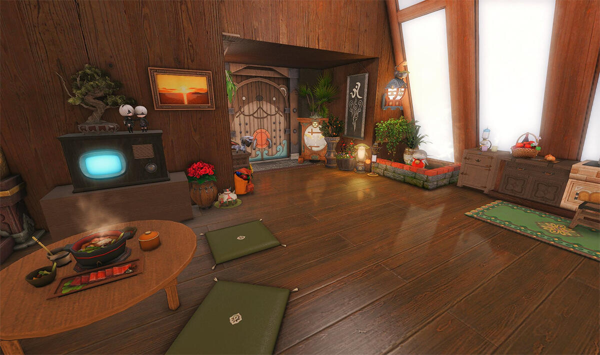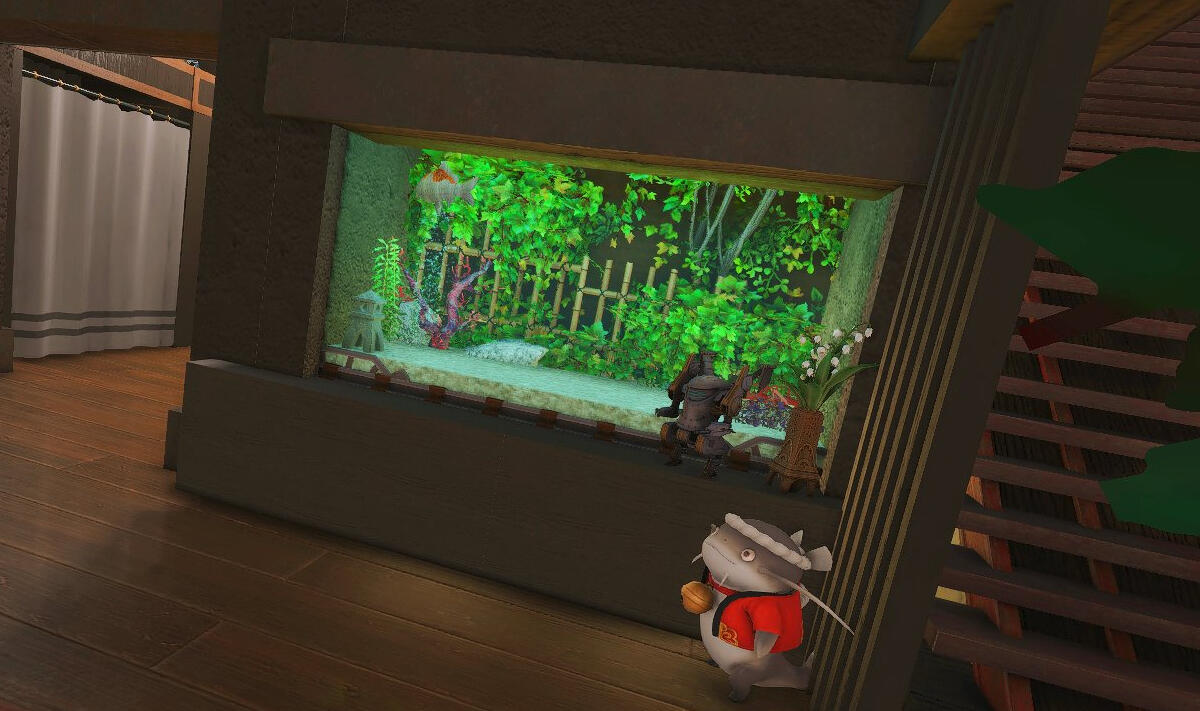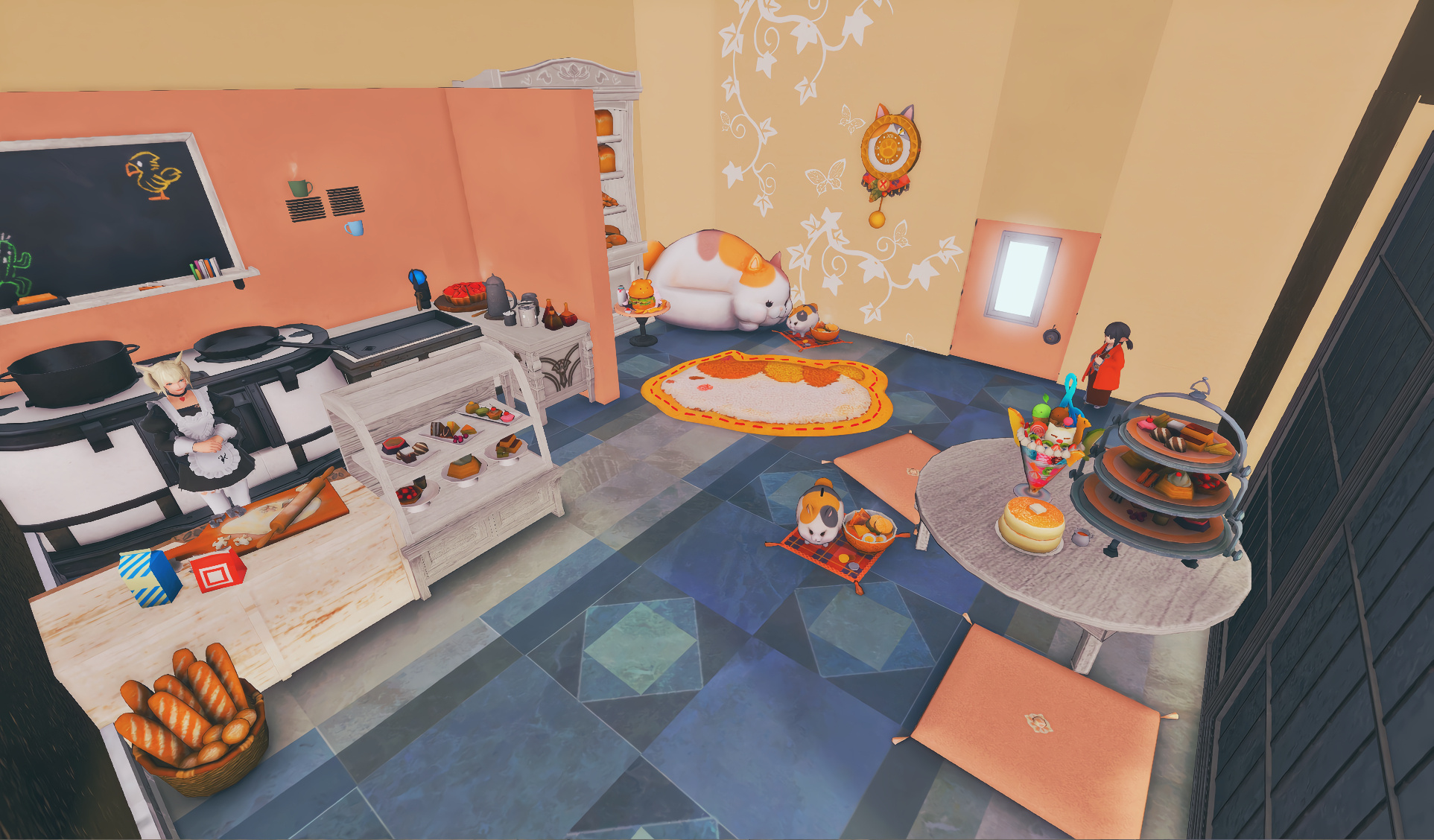 Nestled in the midst of a cozy fc in the mist lies a tiny rustic hut where a little cat girl lives. Singing as she cooks for her friends and guests, the cottagecore vibes are accented with the little 'squeak squeak' sounds from the feet of many a pet namazu that reside here.