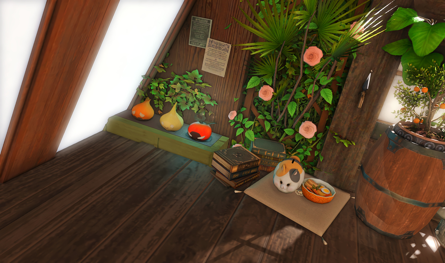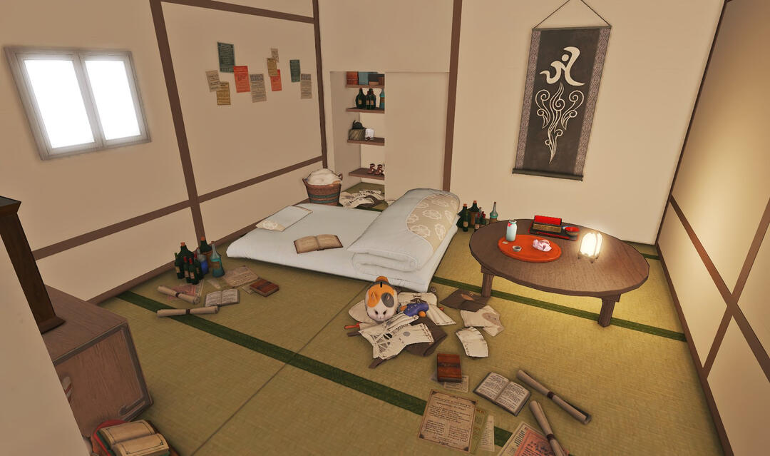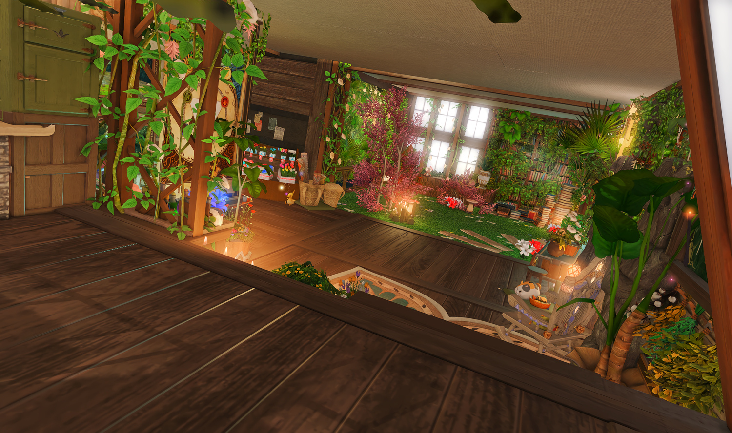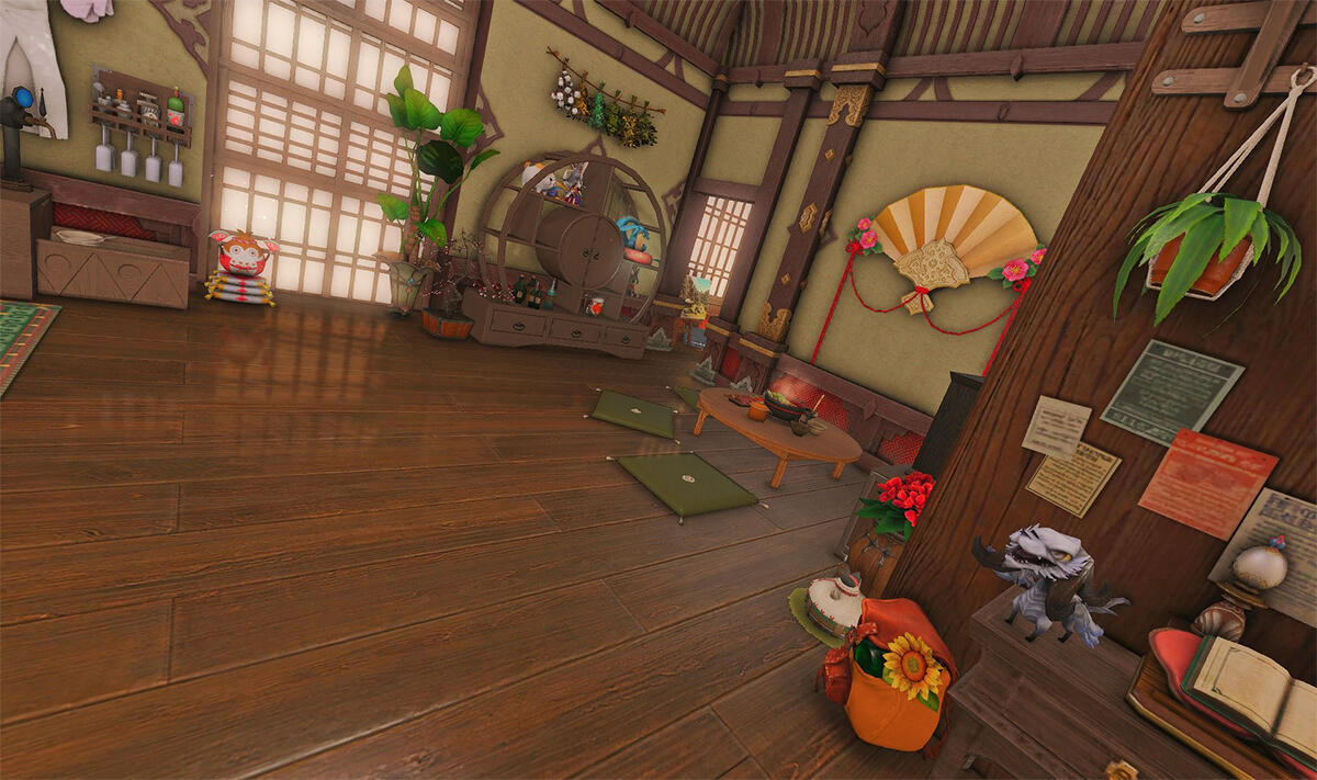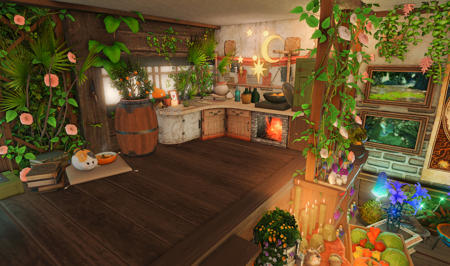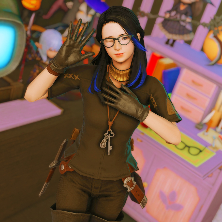 Nestled in the midst of a cozy fc in the mist lies a tiny rustic hut where a little cat girl lives. Singing as she cooks for her friends and guests, the cottagecore vibes are accented with the little 'squeak squeak' sounds from the feet of many a pet namazu that reside here.