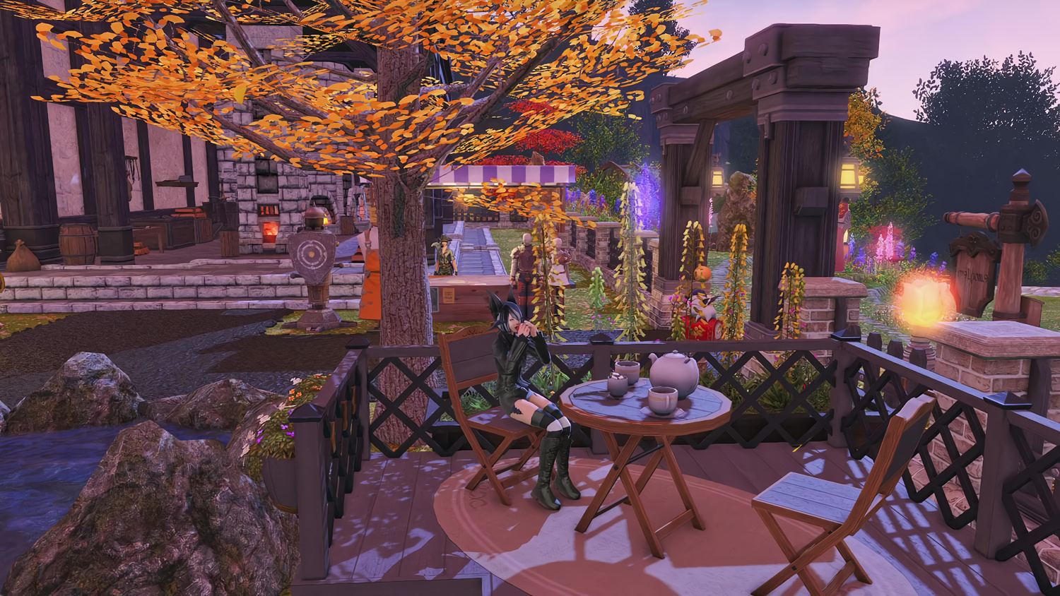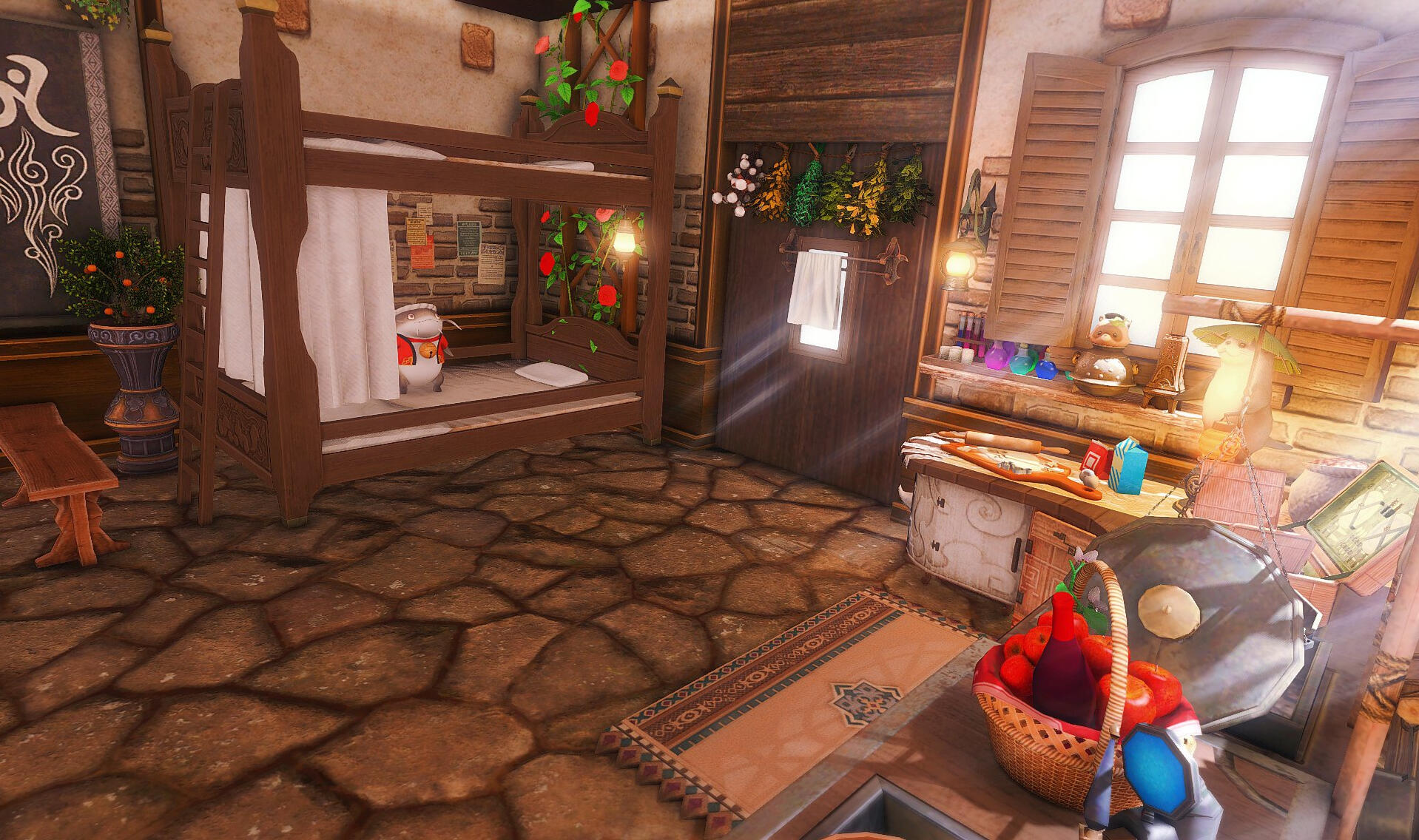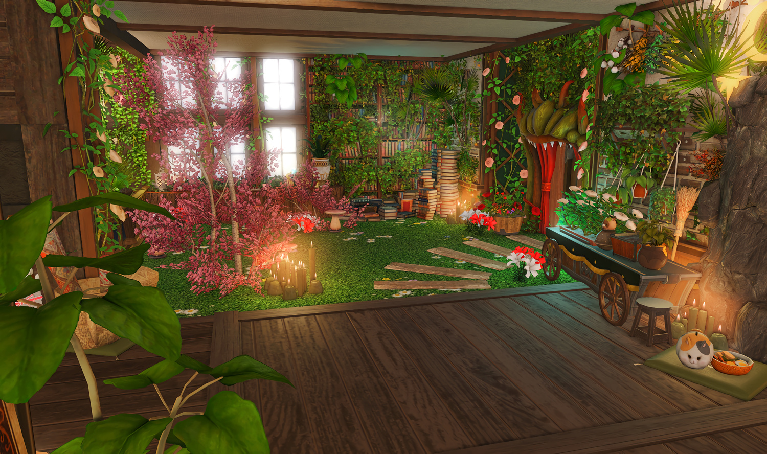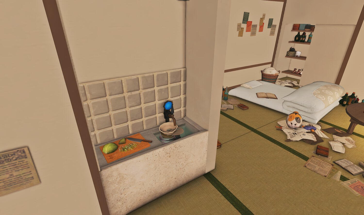 Nestled in the midst of a cozy fc in the mist lies a tiny rustic hut where a little cat girl lives. Singing as she cooks for her friends and guests, the cottagecore vibes are accented with the little 'squeak squeak' sounds from the feet of many a pet namazu that reside here.
