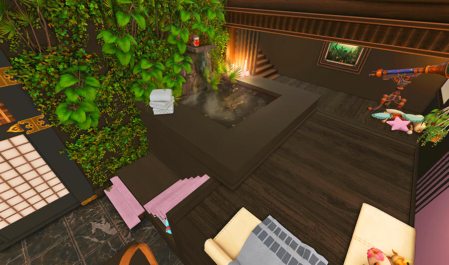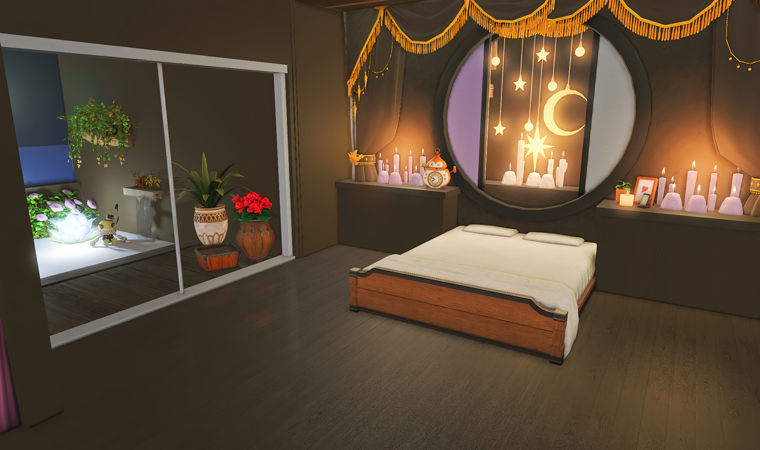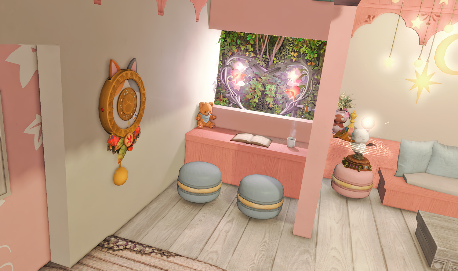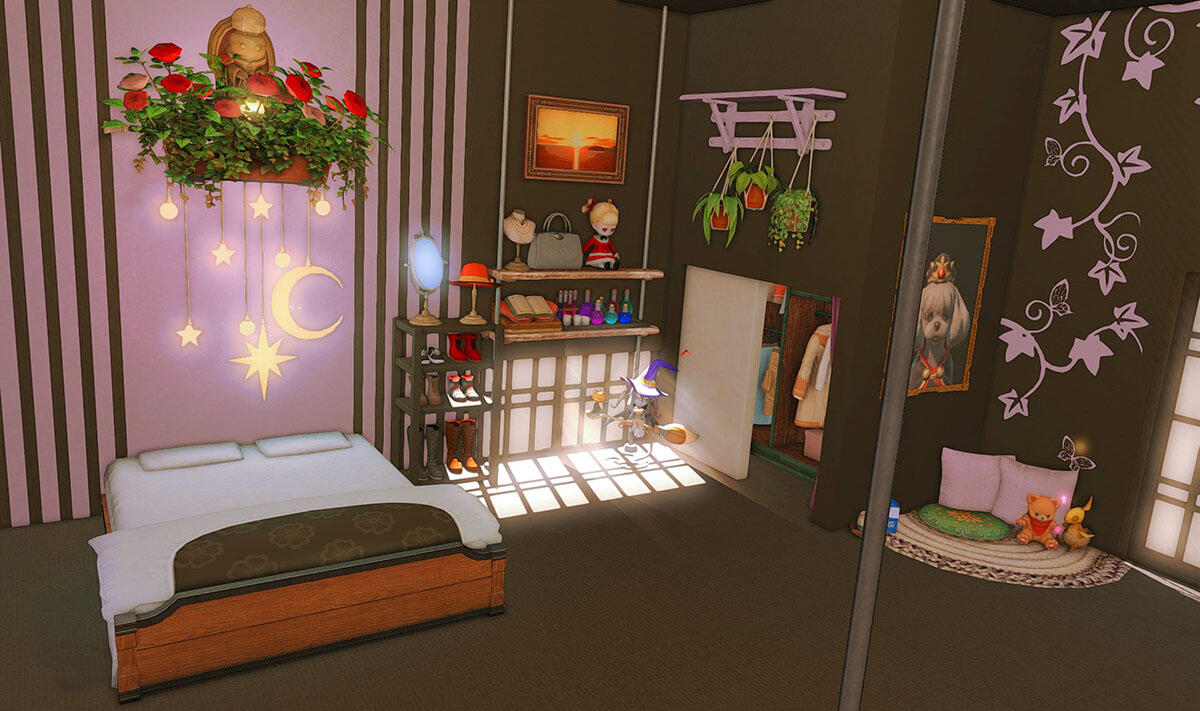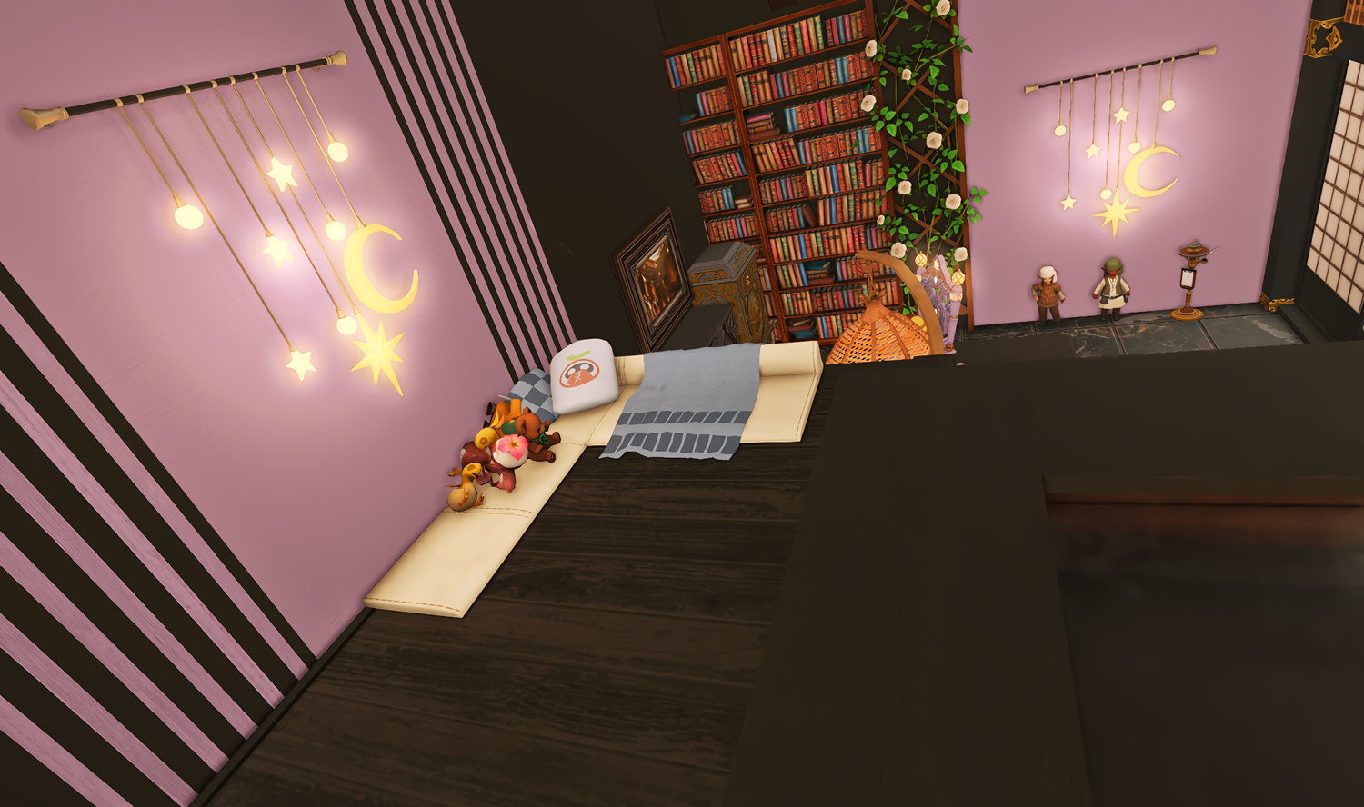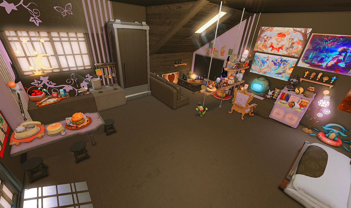 Follow the trail of magical hearts floating gently in the wind and one may find themselves by a little cottage with a majestic waterfall behind it, located on a secluded island in the Lavender Beds. Enter said cottage and you'll find the cutest room that delivers on promises of warm meals and relaxing hot tubs and maybe if you'd like, count the stars through the telescope!