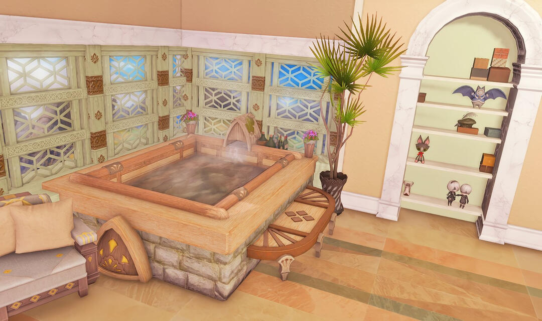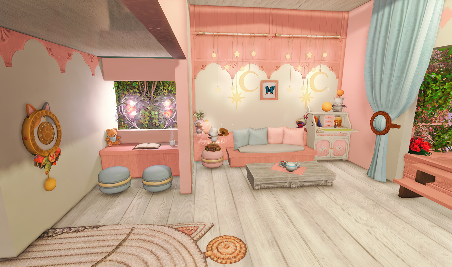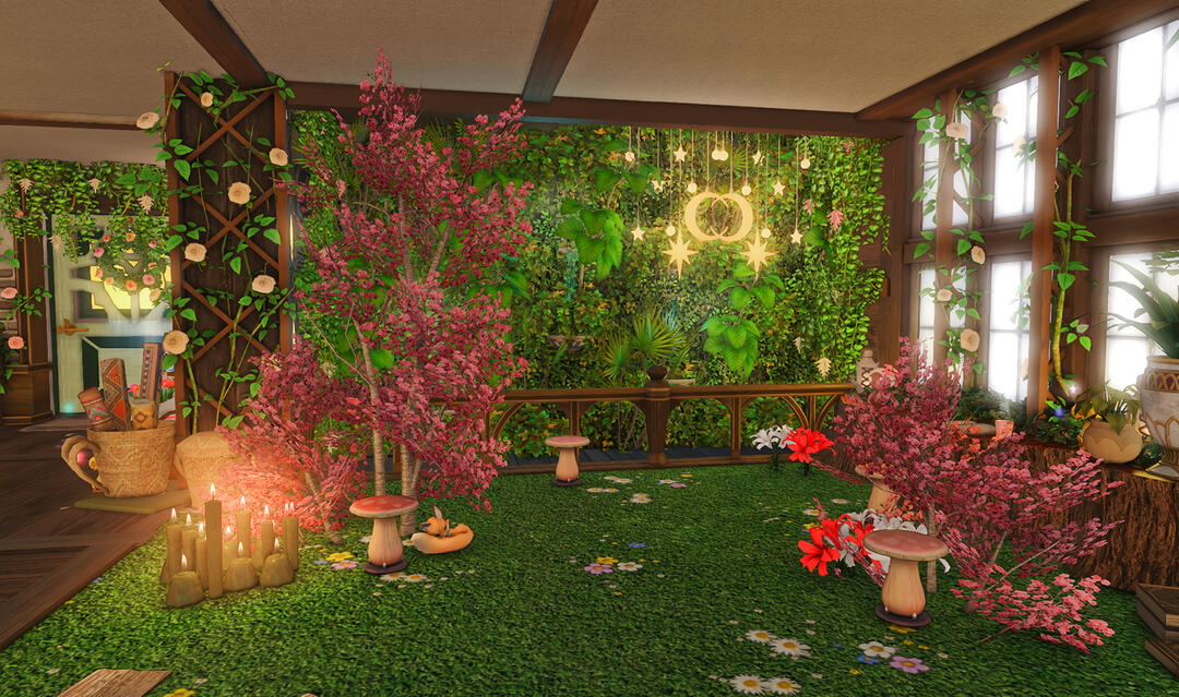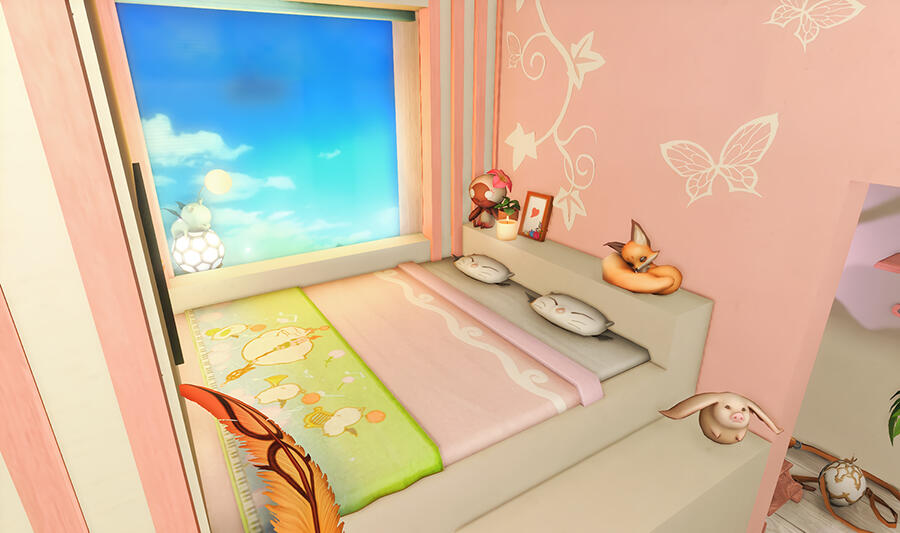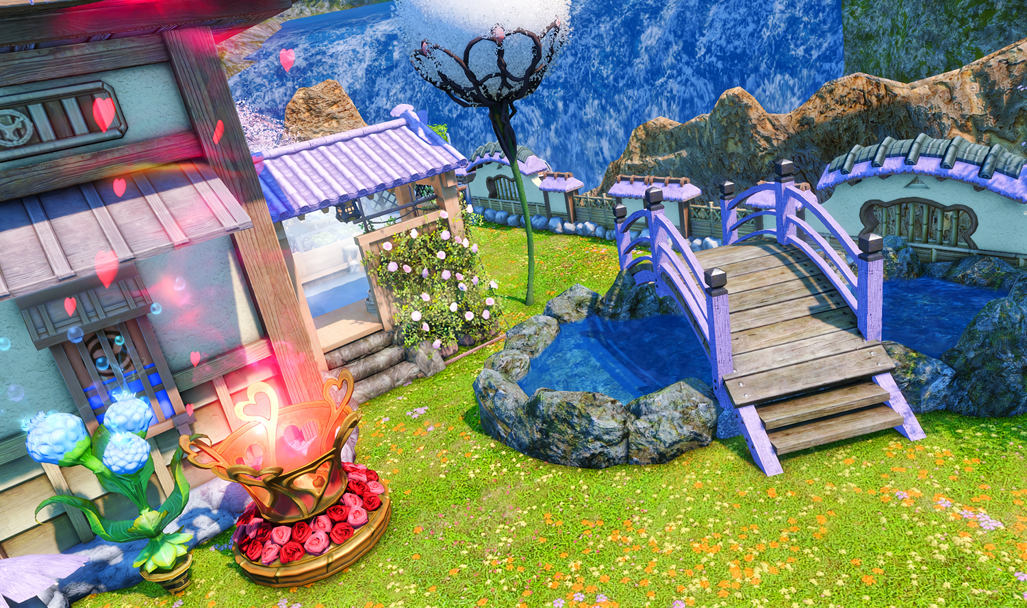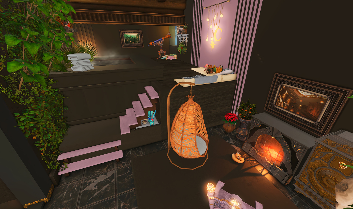 Follow the trail of magical hearts floating gently in the wind and one may find themselves by a little cottage with a majestic waterfall behind it, located on a secluded island in the Lavender Beds. Enter said cottage and you'll find the cutest room that delivers on promises of warm meals and relaxing hot tubs and maybe if you'd like, count the stars through the telescope!