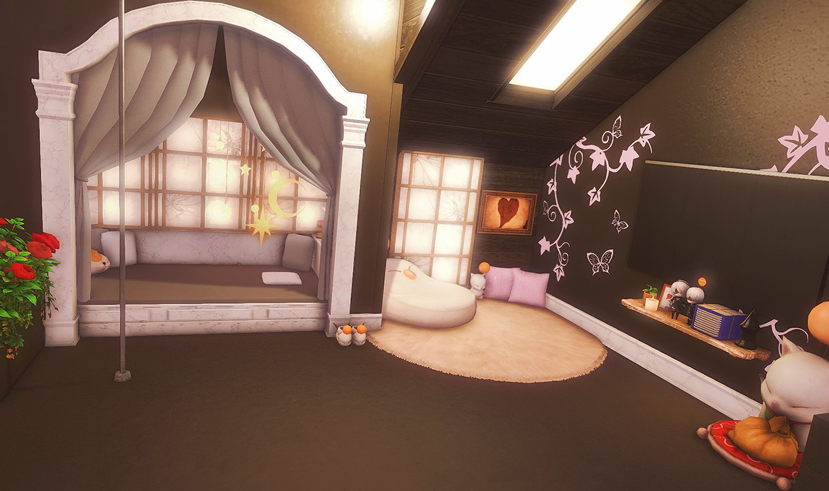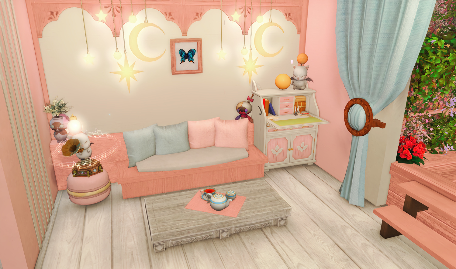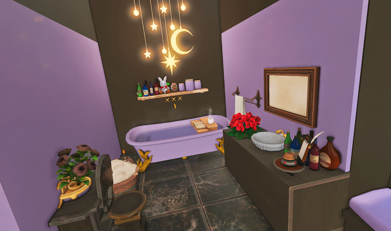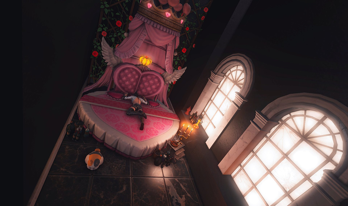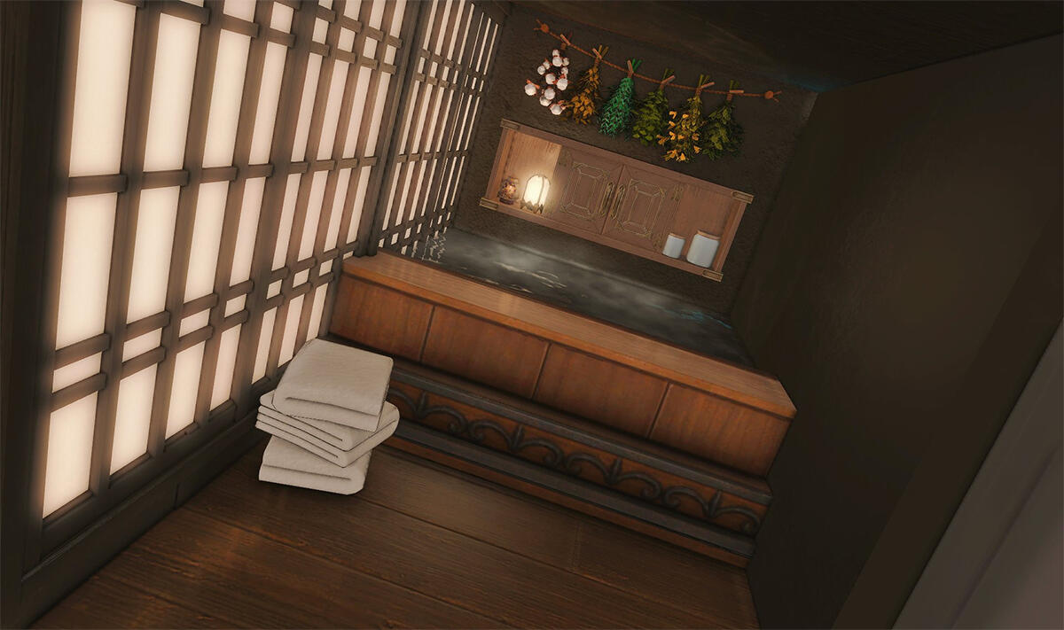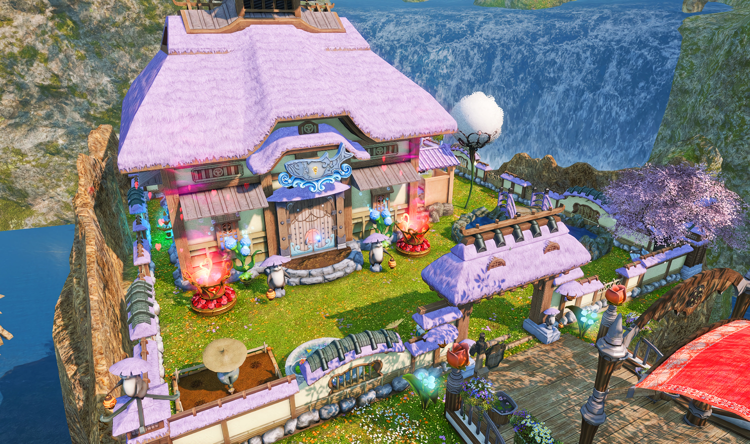Follow the trail of magical hearts floating gently in the wind and one may find themselves by a little cottage with a majestic waterfall behind it, located on a secluded island in the Lavender Beds. Enter said cottage and you'll find the cutest room that delivers on promises of warm meals and relaxing hot tubs and maybe if you'd like, count the stars through the telescope!