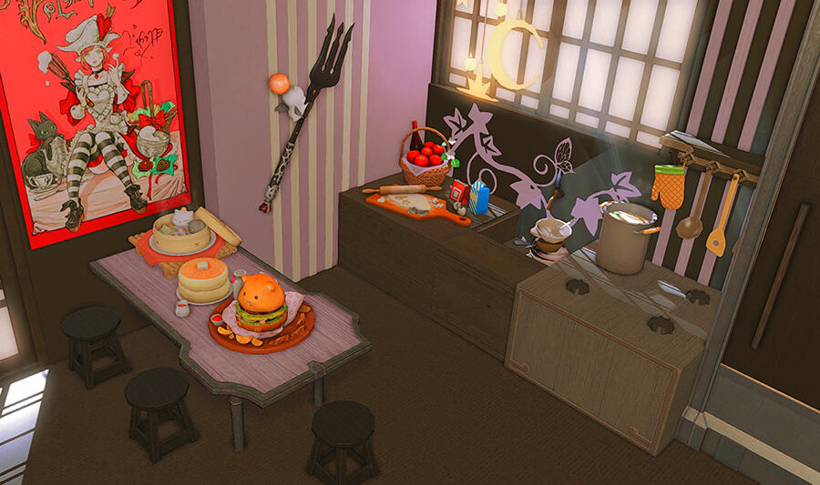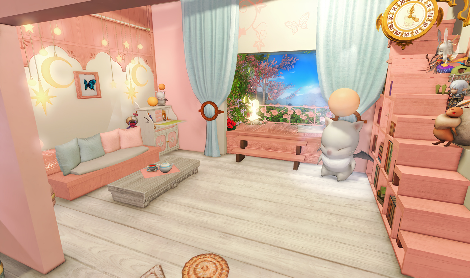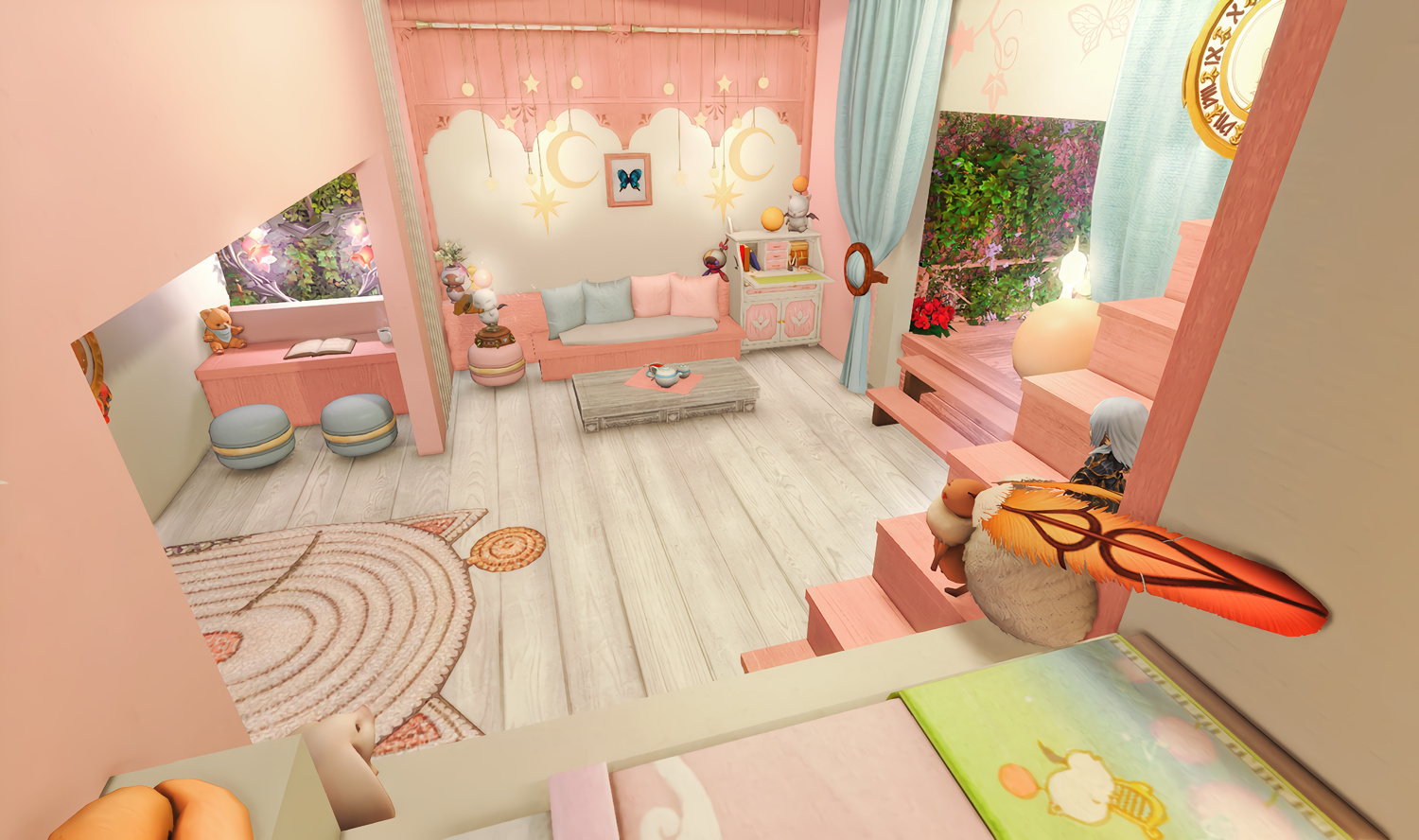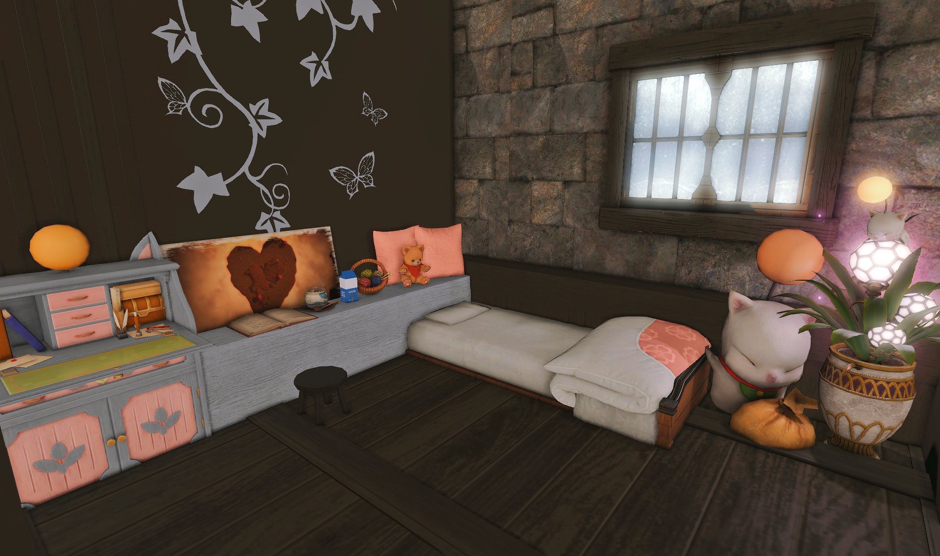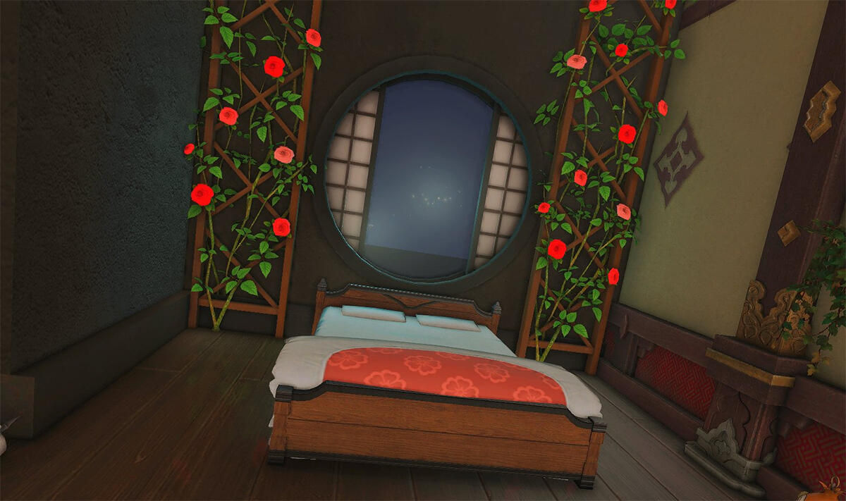 Follow the trail of magical hearts floating gently in the wind and one may find themselves by a little cottage with a majestic waterfall behind it, located on a secluded island in the Lavender Beds. Enter said cottage and you'll find the cutest room that delivers on promises of warm meals and relaxing hot tubs and maybe if you'd like, count the stars through the telescope!
