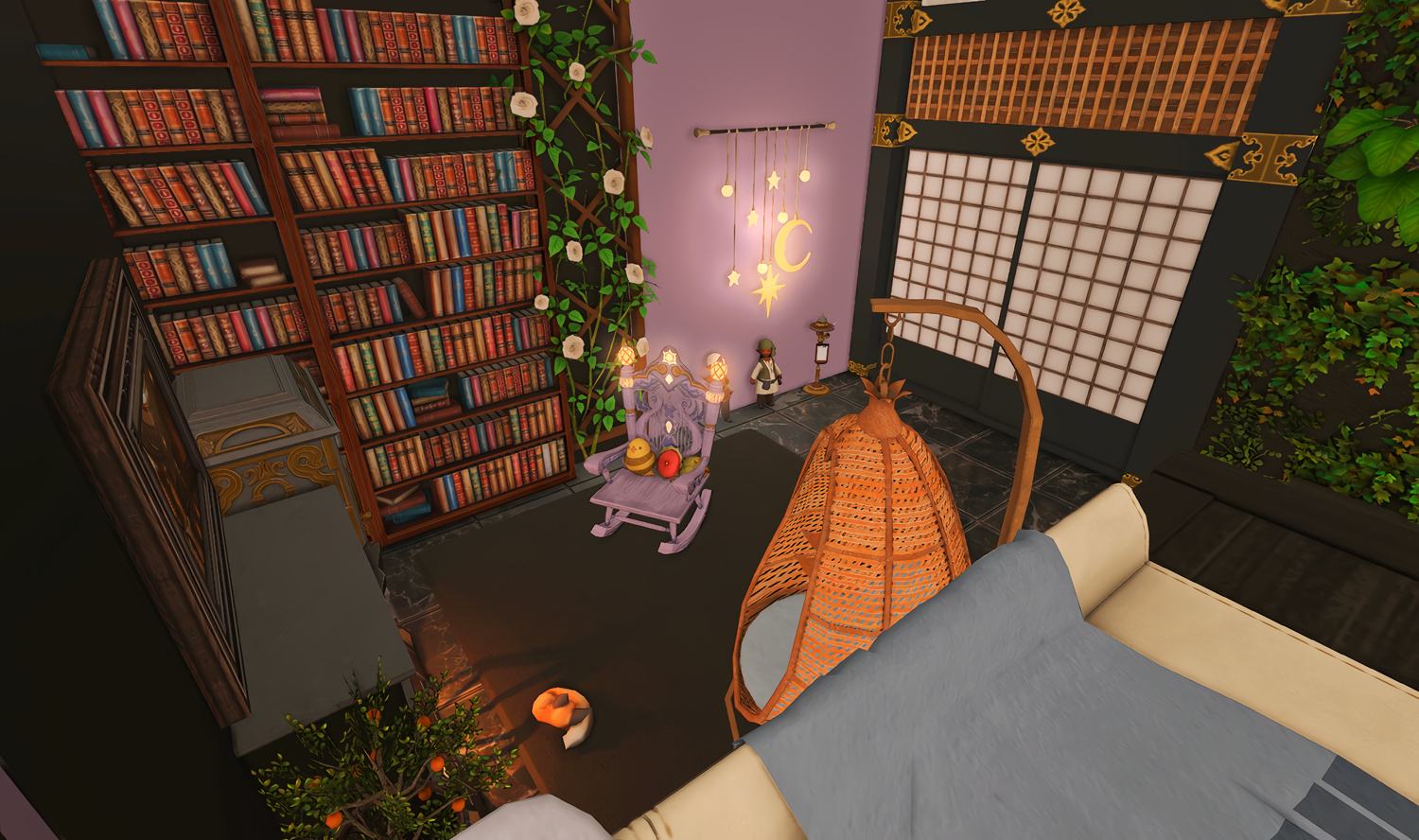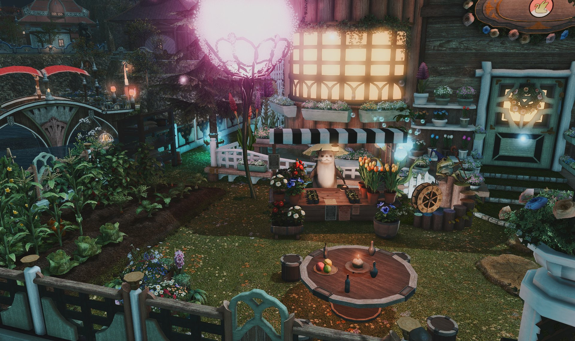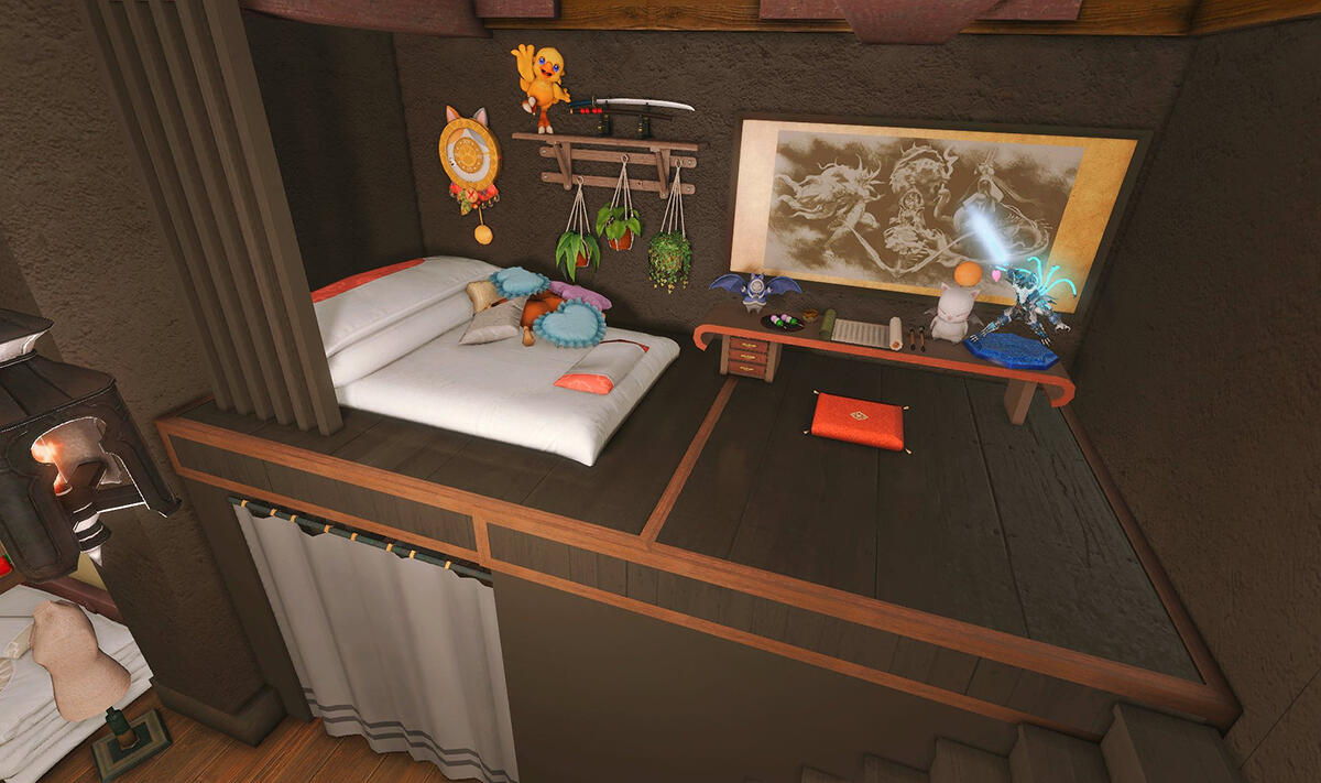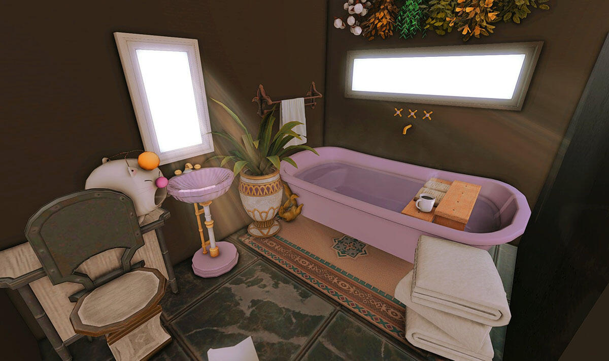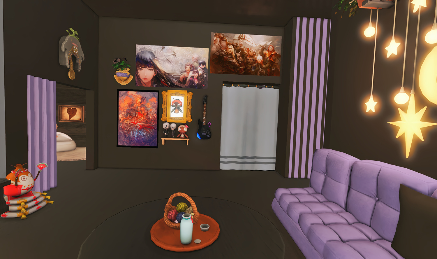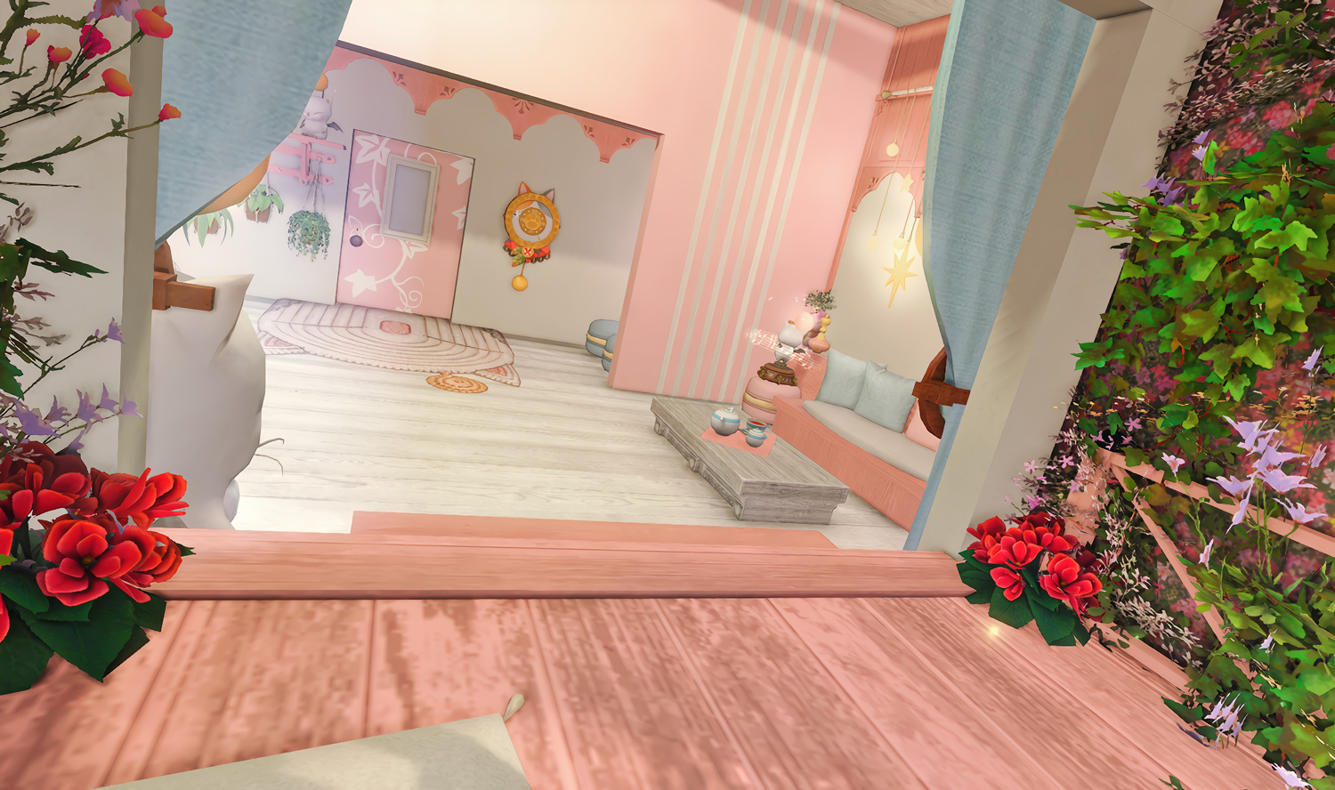 Follow the trail of magical hearts floating gently in the wind and one may find themselves by a little cottage with a majestic waterfall behind it, located on a secluded island in the Lavender Beds. Enter said cottage and you'll find the cutest room that delivers on promises of warm meals and relaxing hot tubs and maybe if you'd like, count the stars through the telescope!