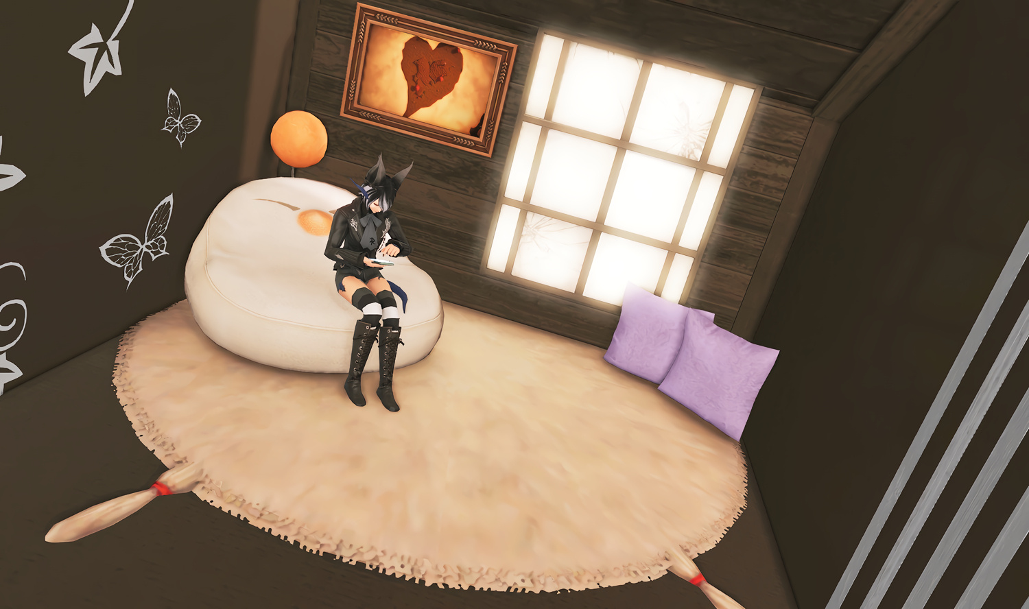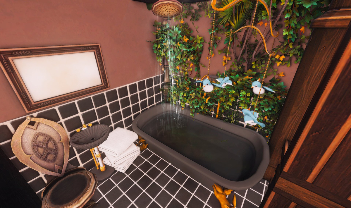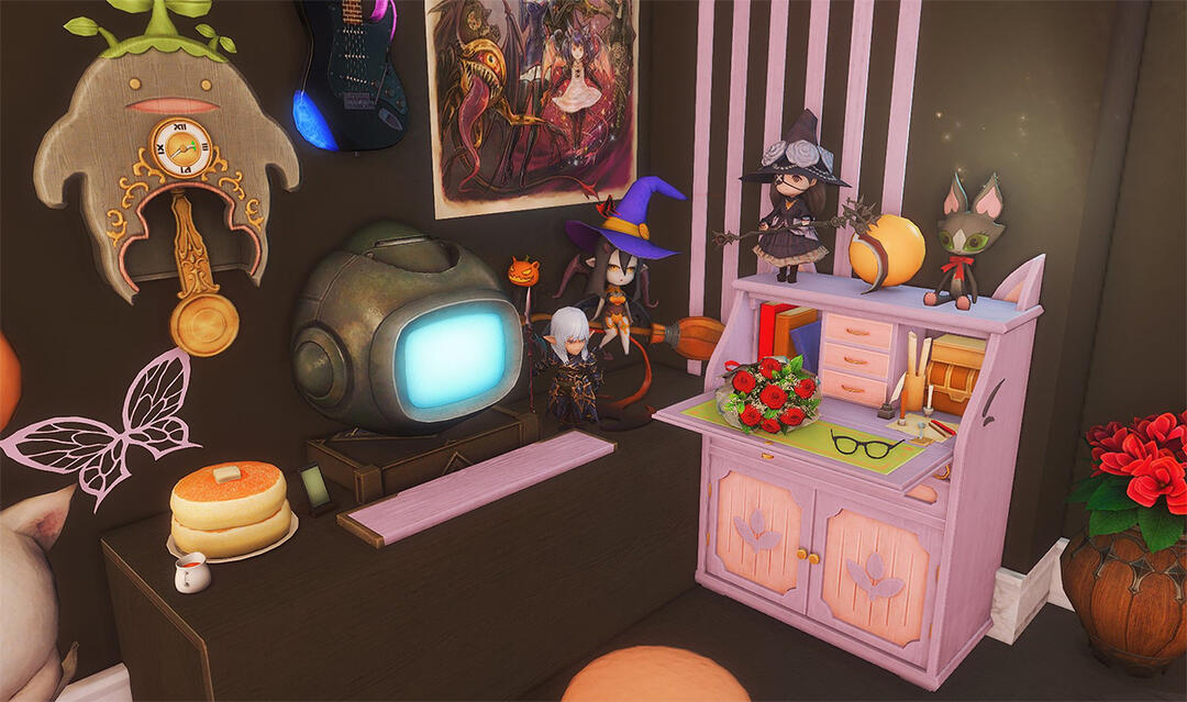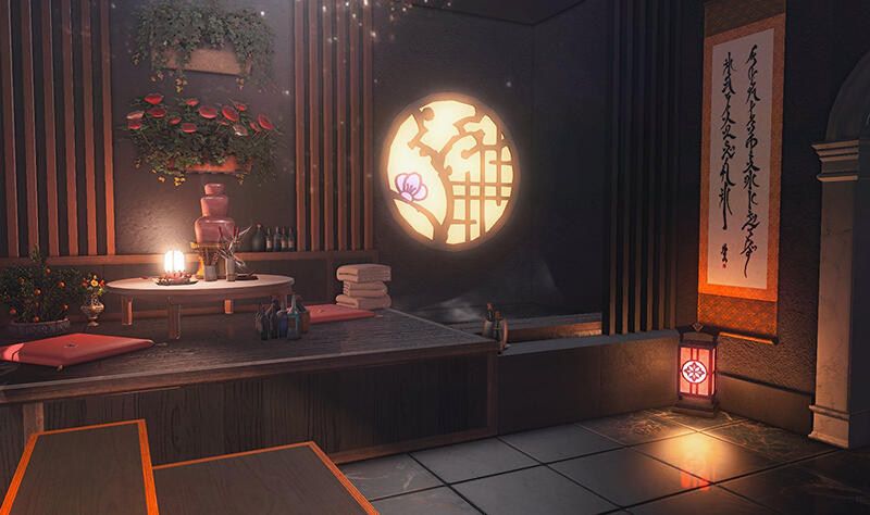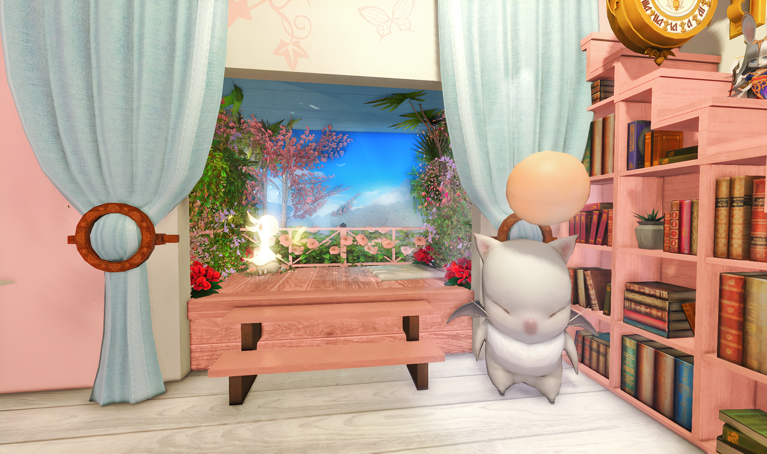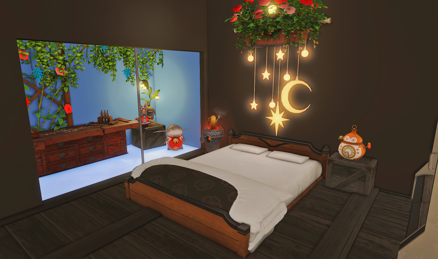 Follow the trail of magical hearts floating gently in the wind and one may find themselves by a little cottage with a majestic waterfall behind it, located on a secluded island in the Lavender Beds. Enter said cottage and you'll find the cutest room that delivers on promises of warm meals and relaxing hot tubs and maybe if you'd like, count the stars through the telescope!