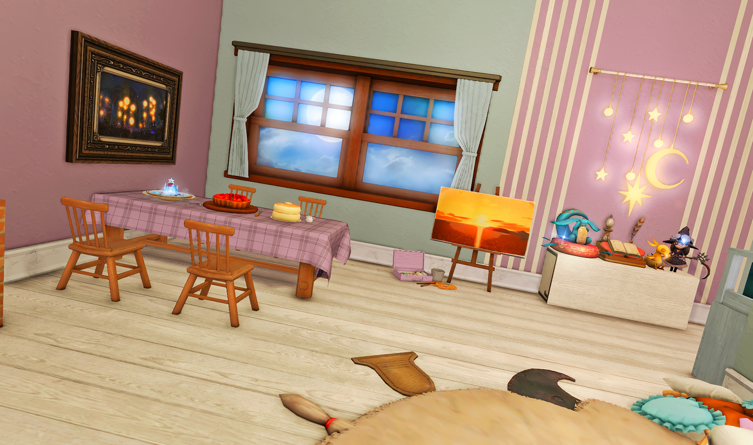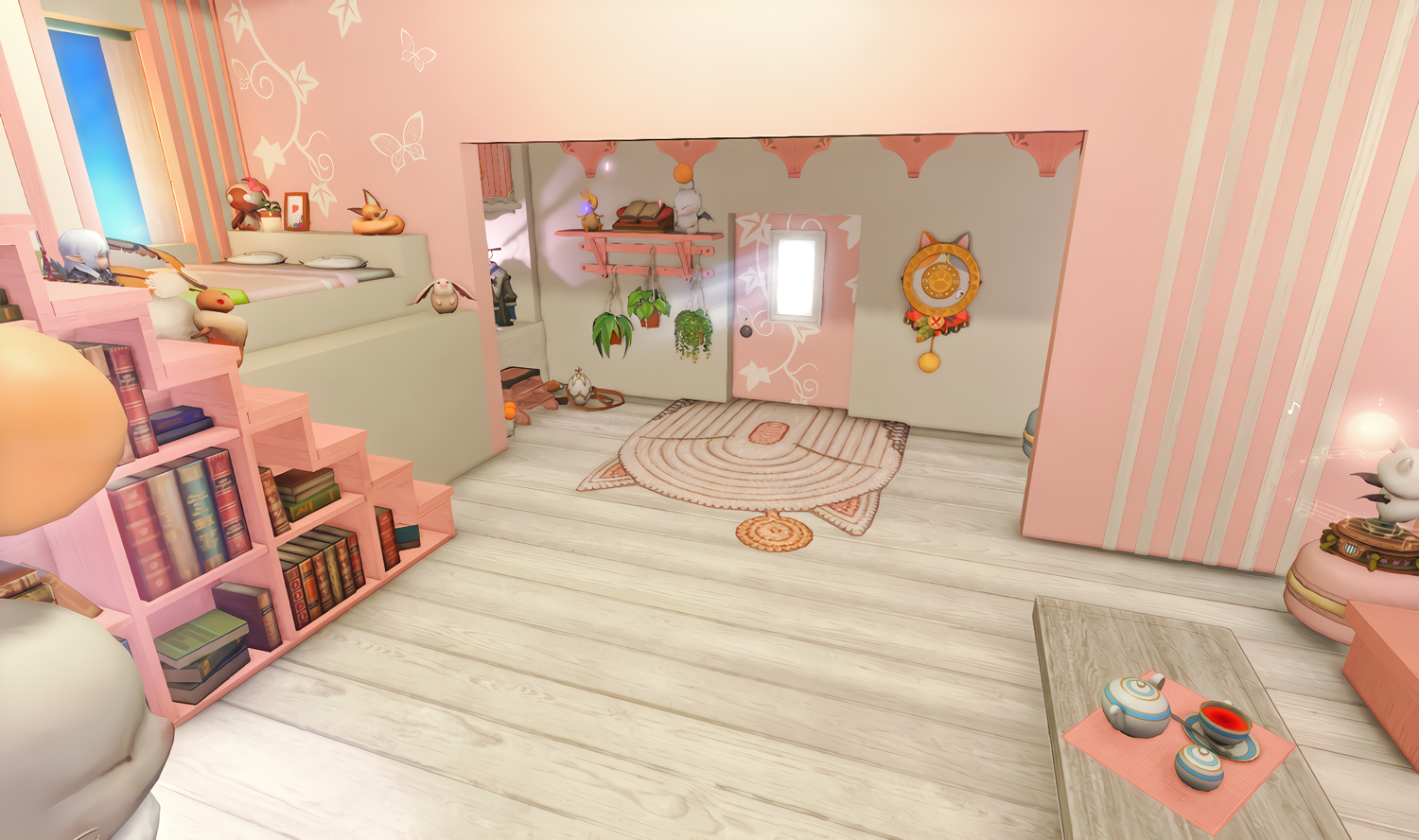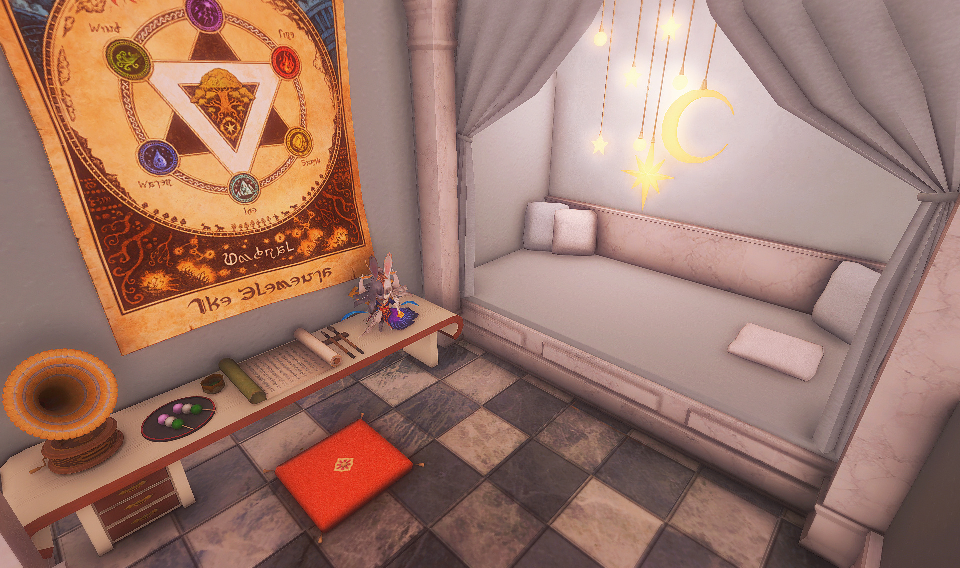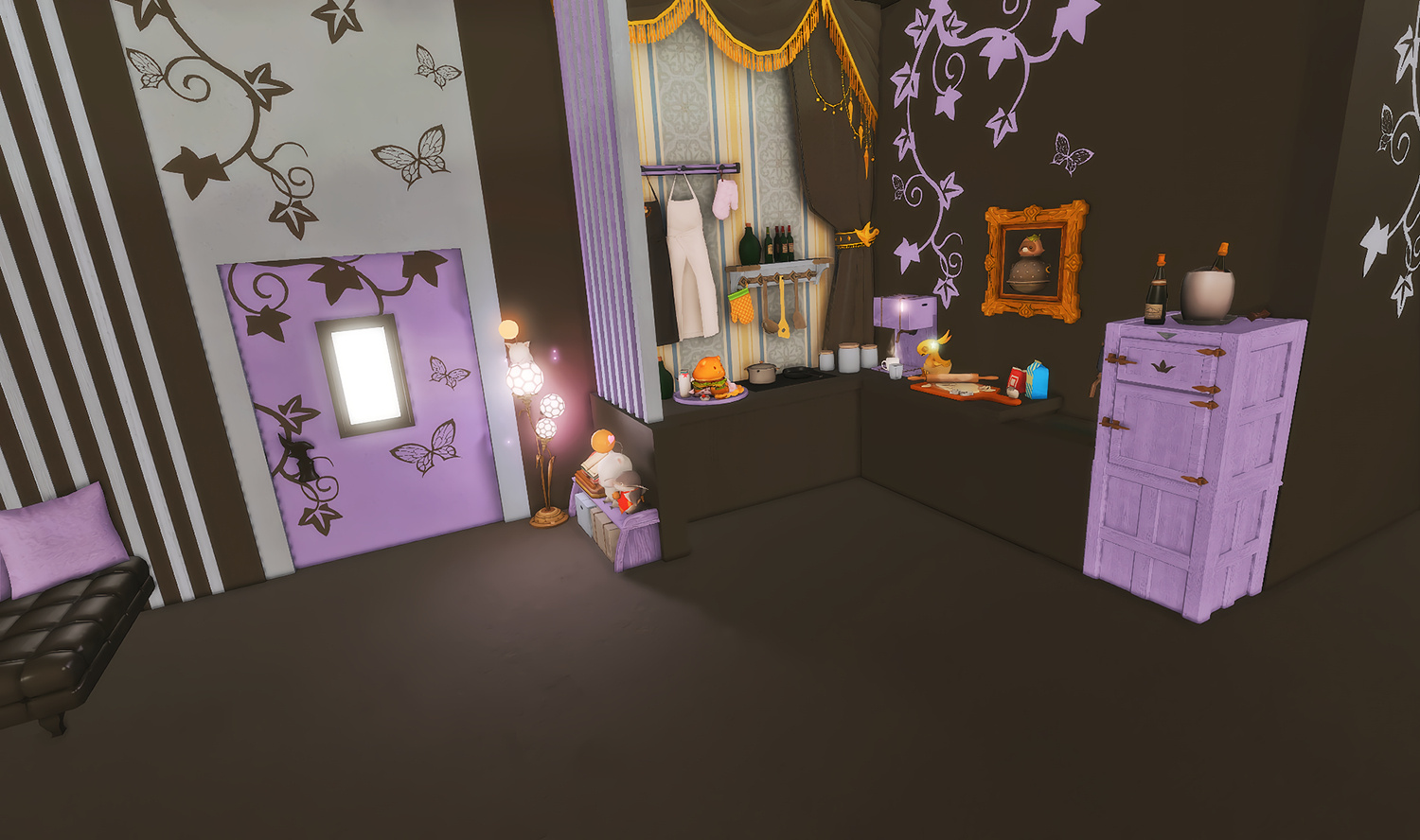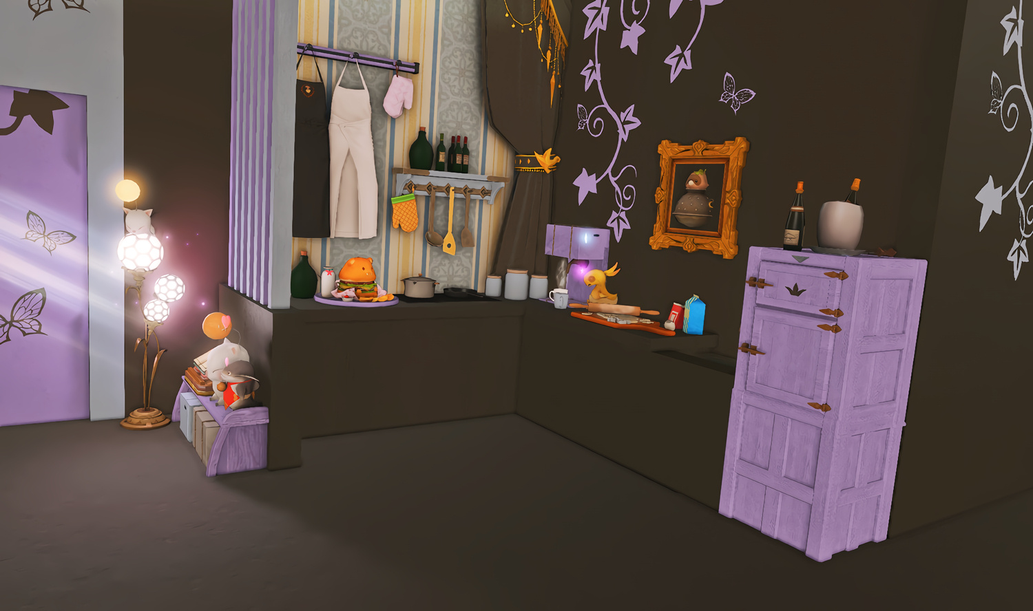 Follow the trail of magical hearts floating gently in the wind and one may find themselves by a little cottage with a majestic waterfall behind it, located on a secluded island in the Lavender Beds. Enter said cottage and you'll find the cutest room that delivers on promises of warm meals and relaxing hot tubs and maybe if you'd like, count the stars through the telescope!
