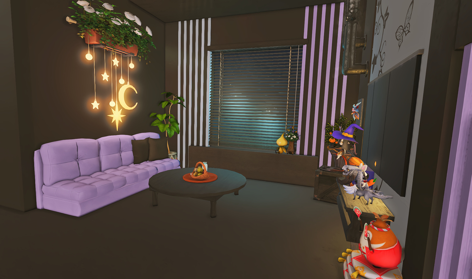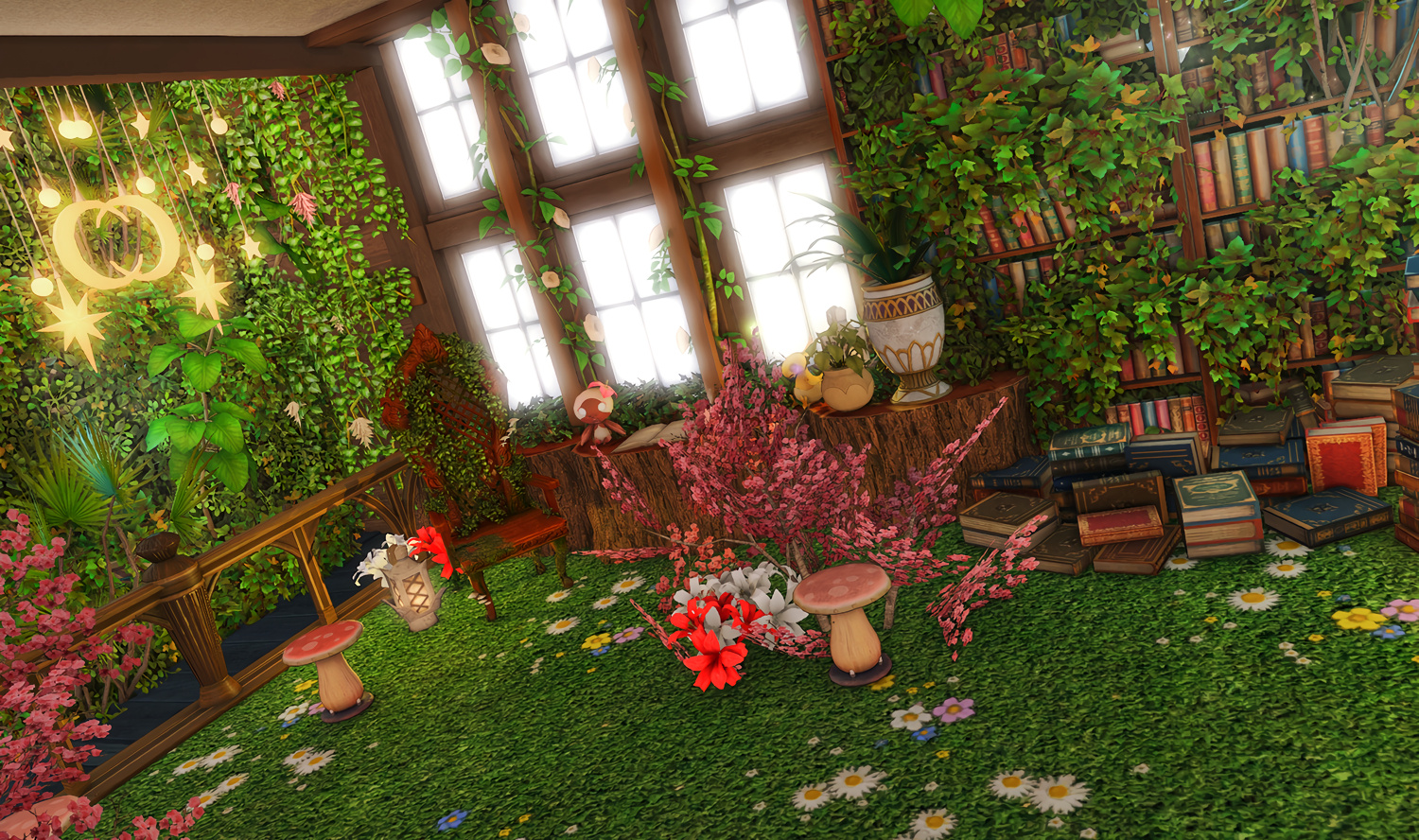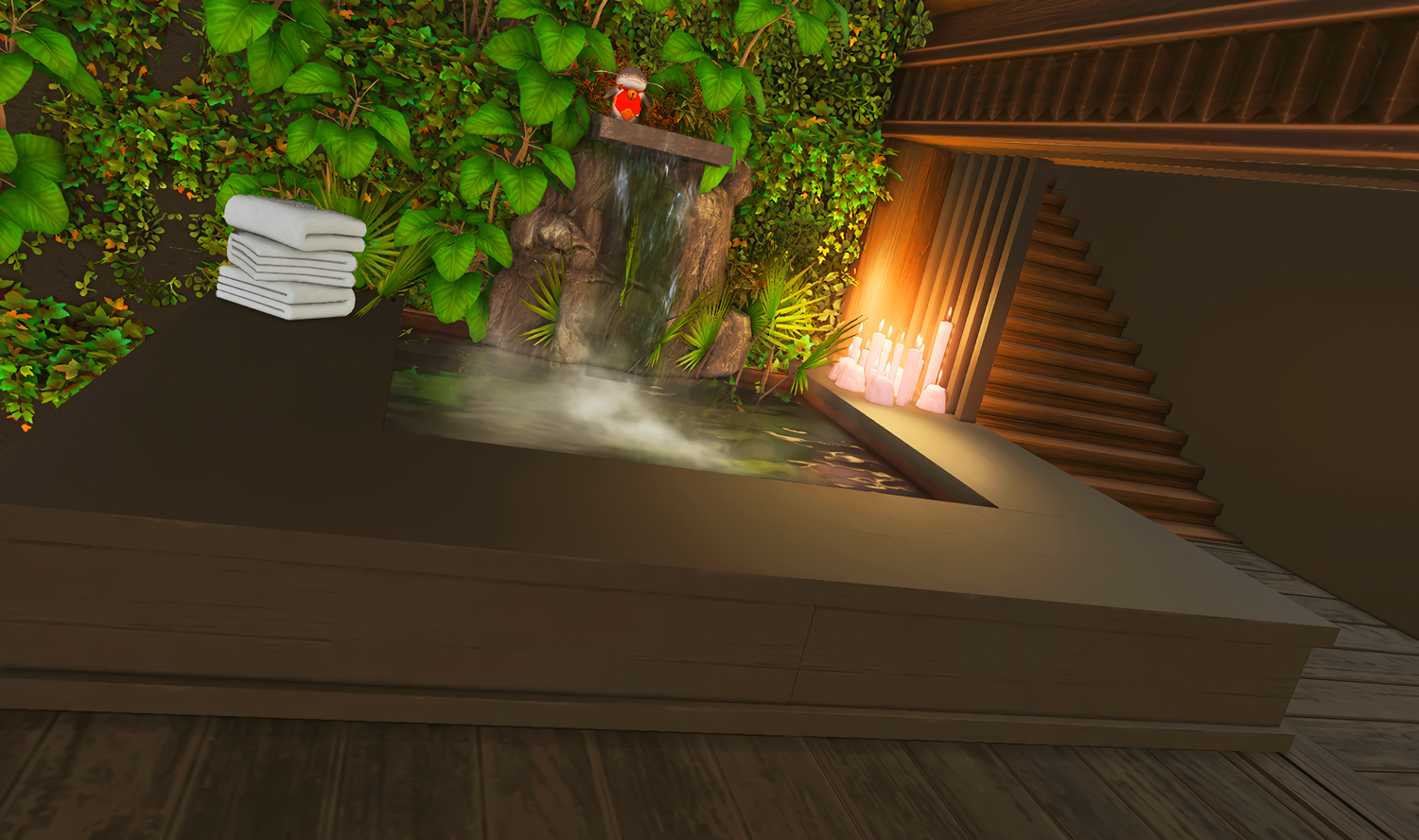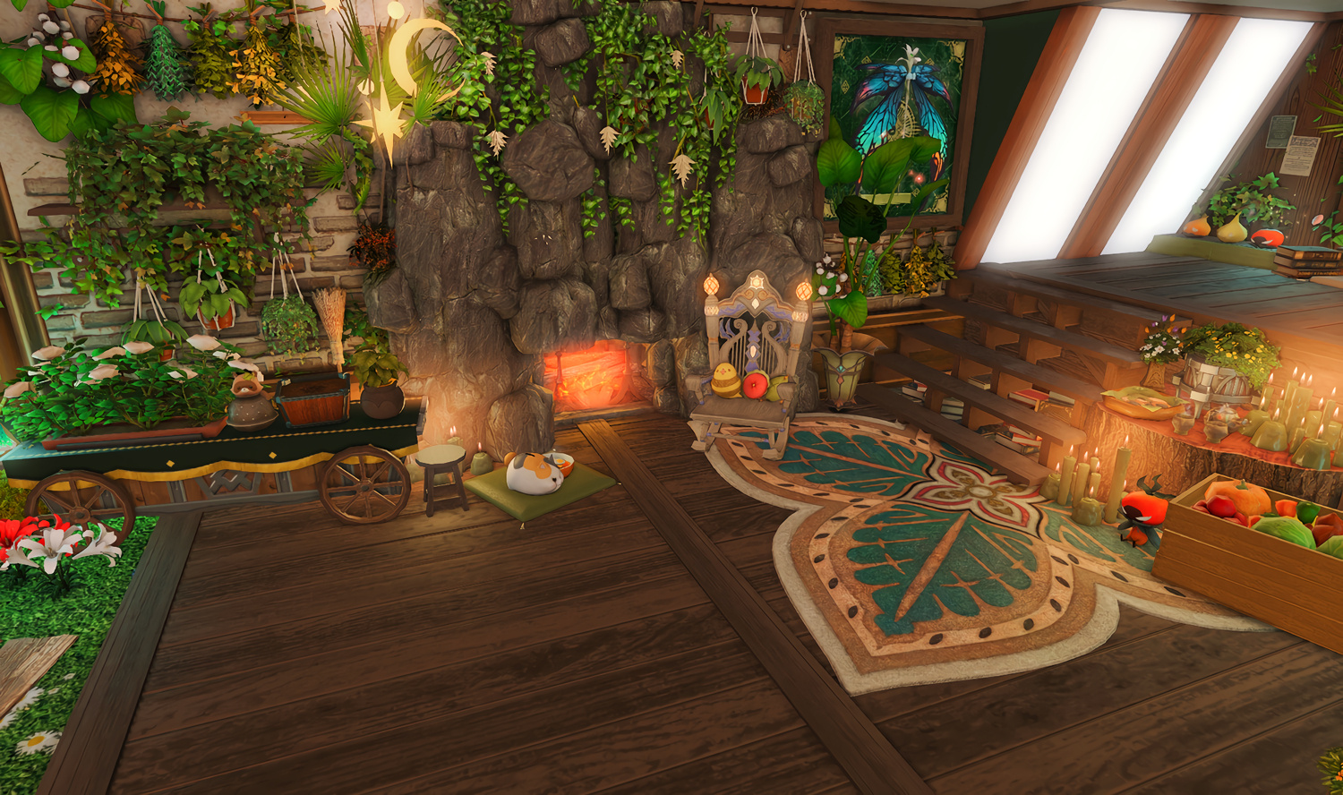 Follow the trail of magical hearts floating gently in the wind and one may find themselves by a little cottage with a majestic waterfall behind it, located on a secluded island in the Lavender Beds. Enter said cottage and you'll find the cutest room that delivers on promises of warm meals and relaxing hot tubs and maybe if you'd like, count the stars through the telescope!
