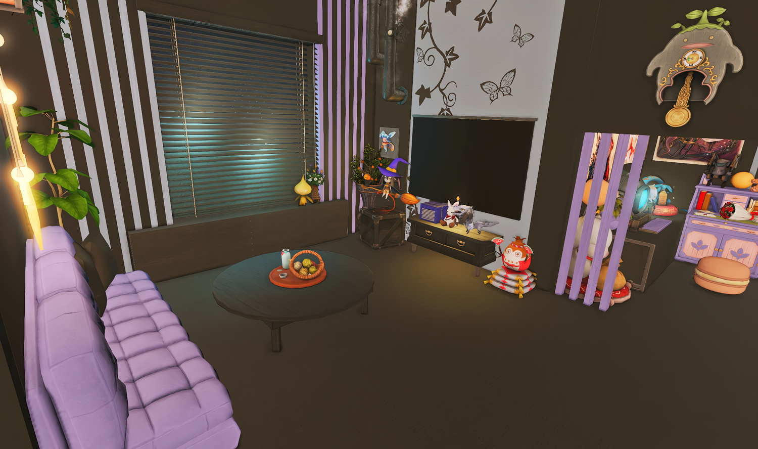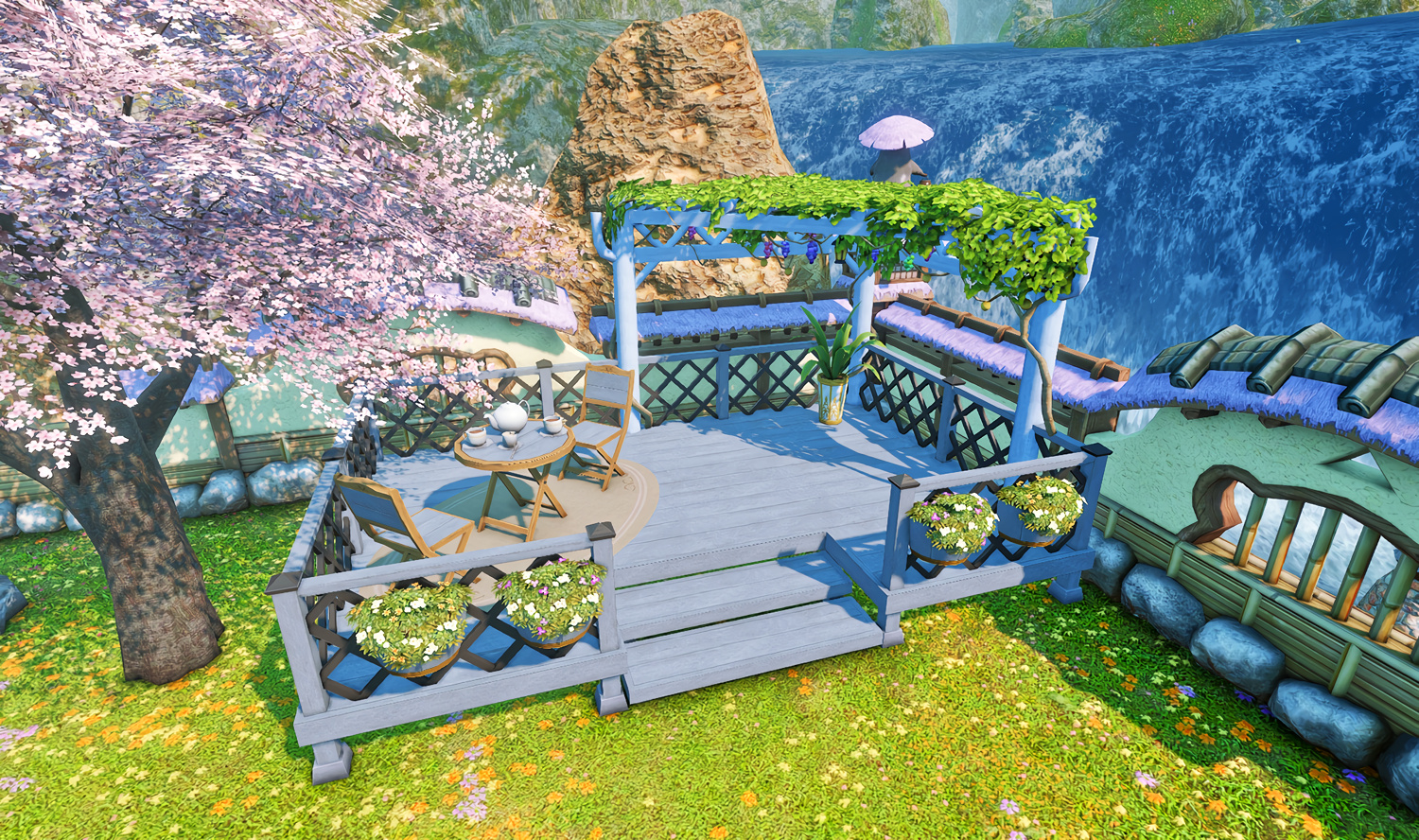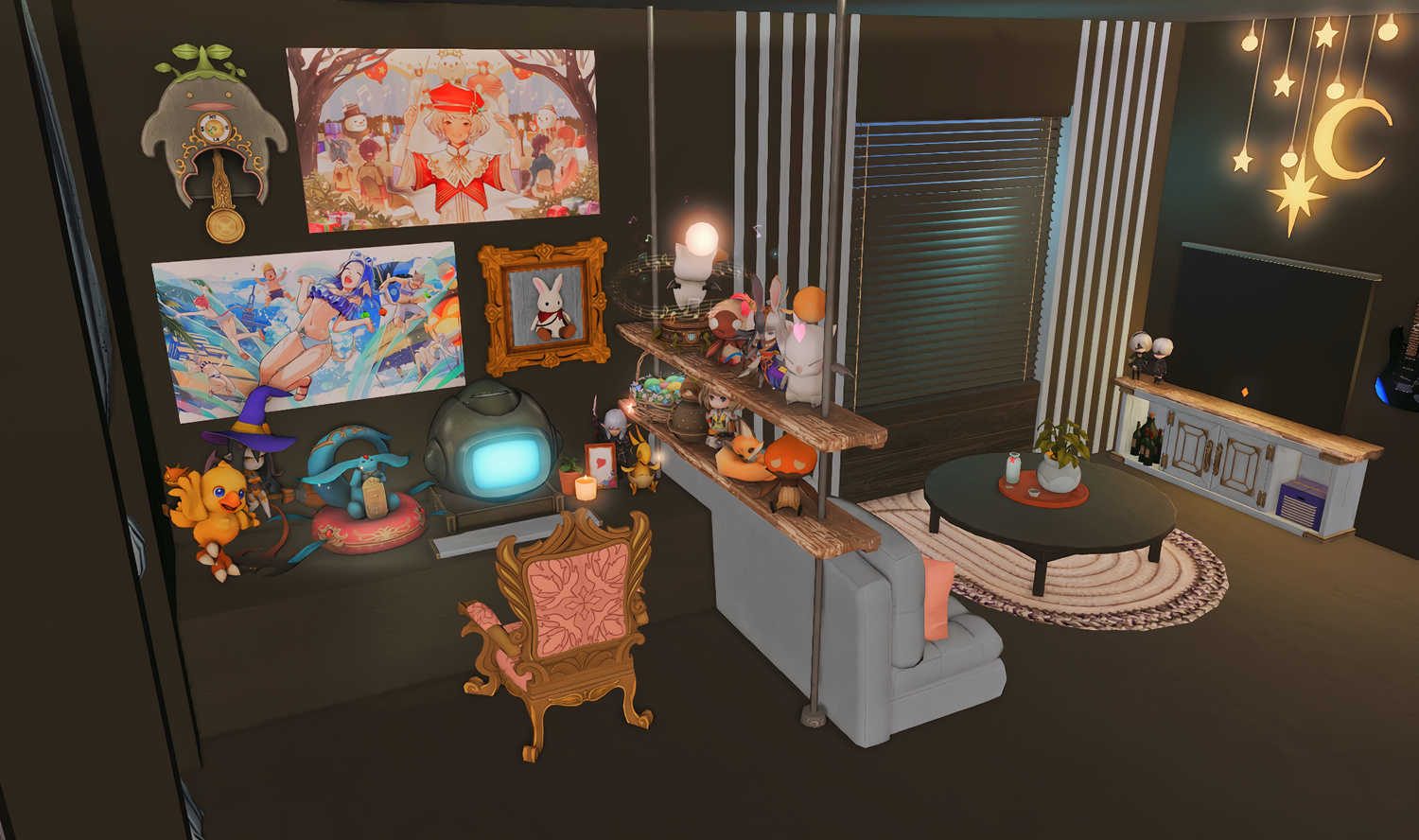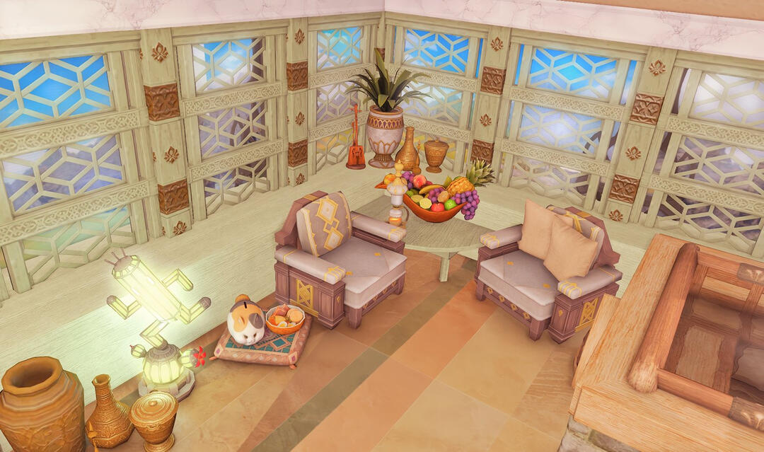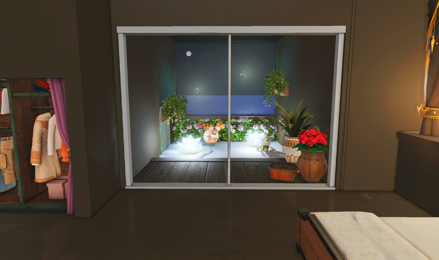 Follow the trail of magical hearts floating gently in the wind and one may find themselves by a little cottage with a majestic waterfall behind it, located on a secluded island in the Lavender Beds. Enter said cottage and you'll find the cutest room that delivers on promises of warm meals and relaxing hot tubs and maybe if you'd like, count the stars through the telescope!