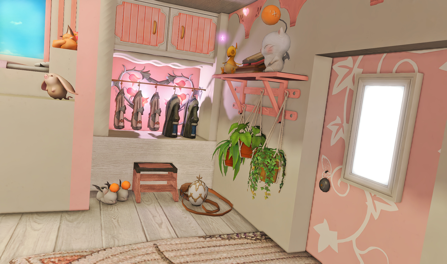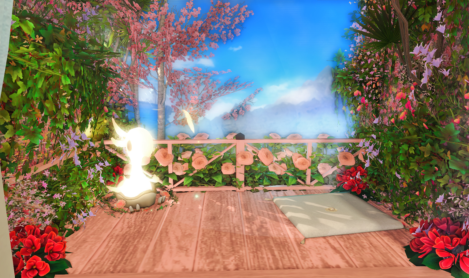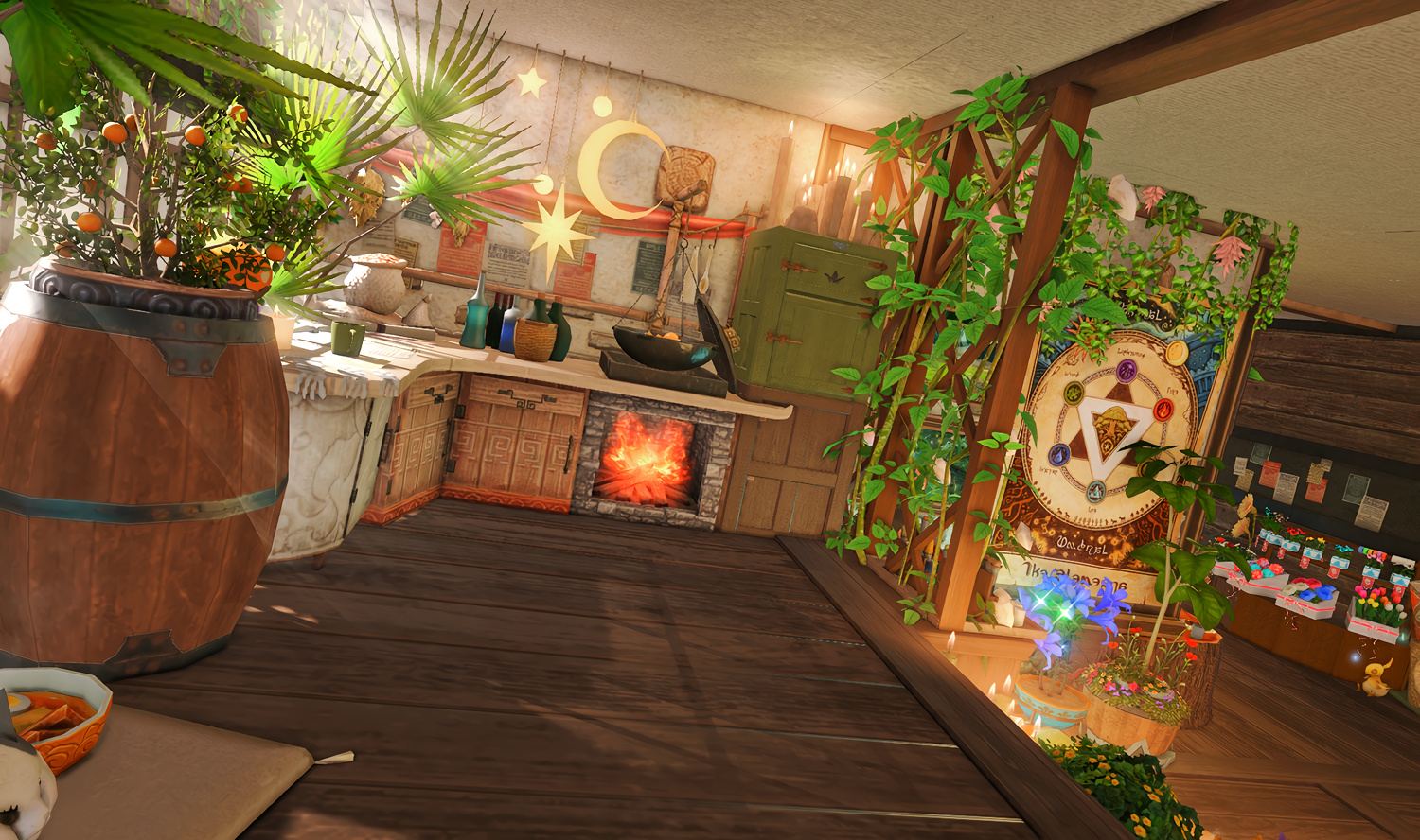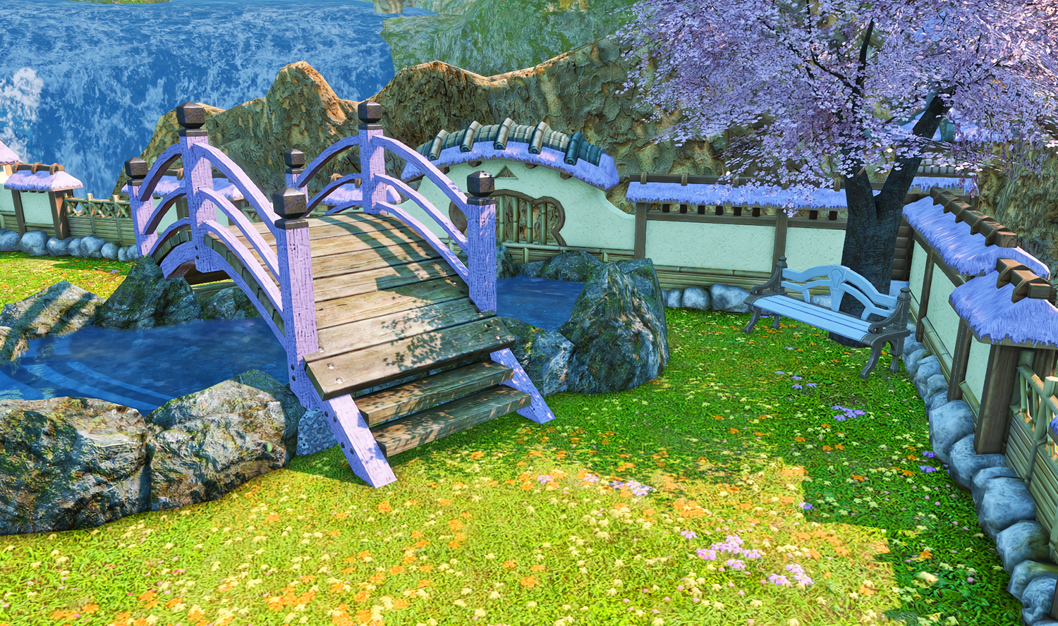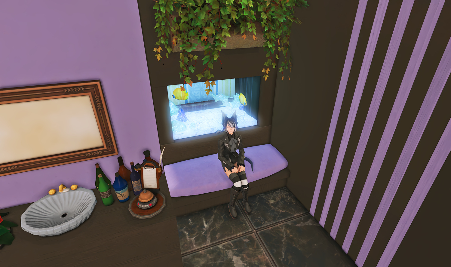 Follow the trail of magical hearts floating gently in the wind and one may find themselves by a little cottage with a majestic waterfall behind it, located on a secluded island in the Lavender Beds. Enter said cottage and you'll find the cutest room that delivers on promises of warm meals and relaxing hot tubs and maybe if you'd like, count the stars through the telescope!