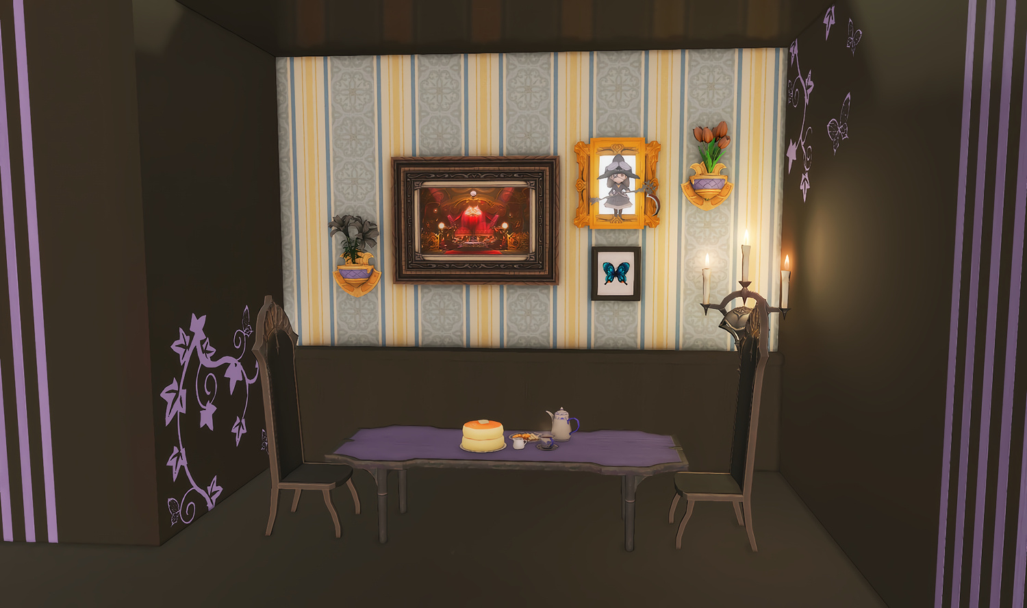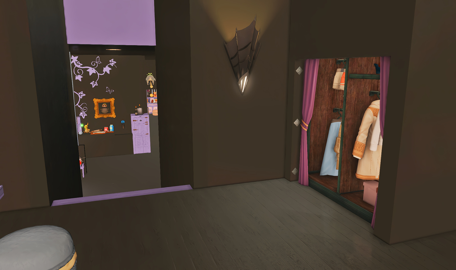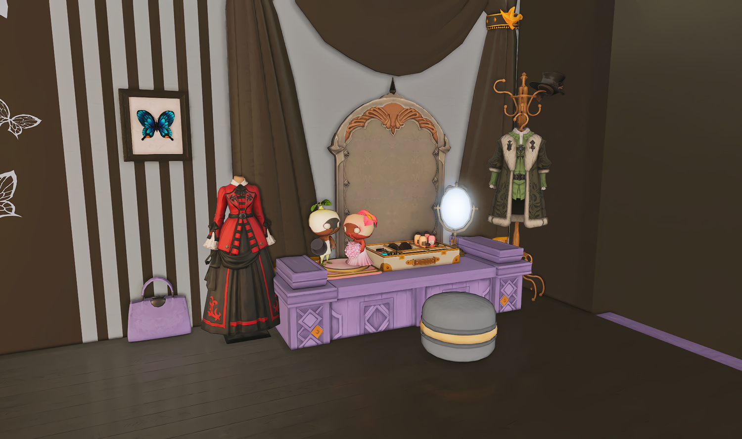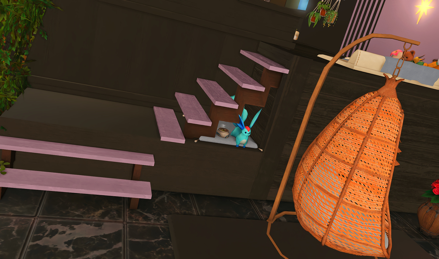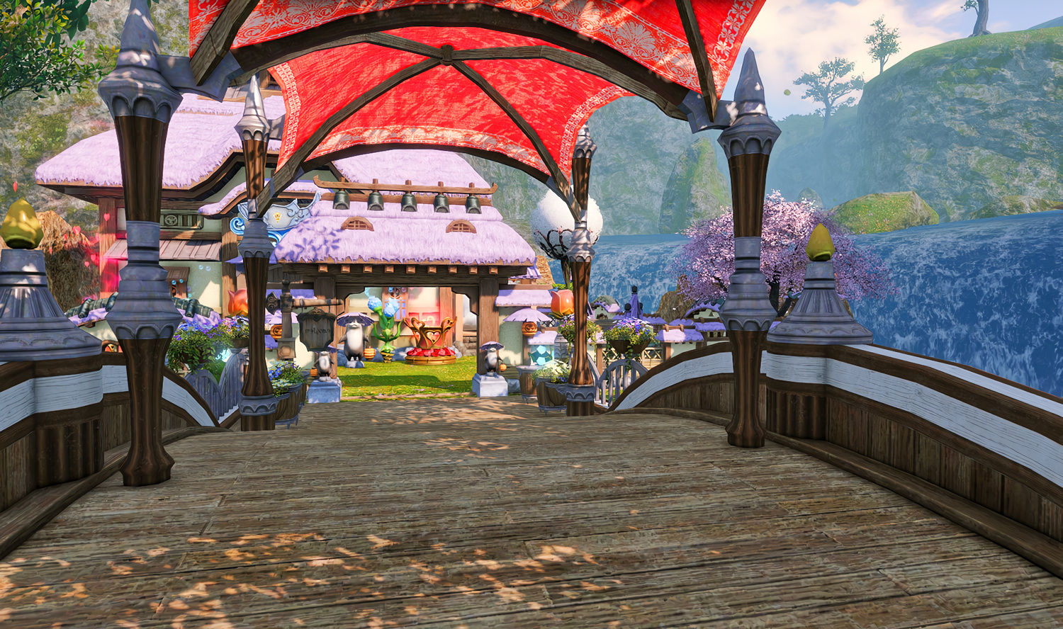 Follow the trail of magical hearts floating gently in the wind and one may find themselves by a little cottage with a majestic waterfall behind it, located on a secluded island in the Lavender Beds. Enter said cottage and you'll find the cutest room that delivers on promises of warm meals and relaxing hot tubs and maybe if you'd like, count the stars through the telescope!