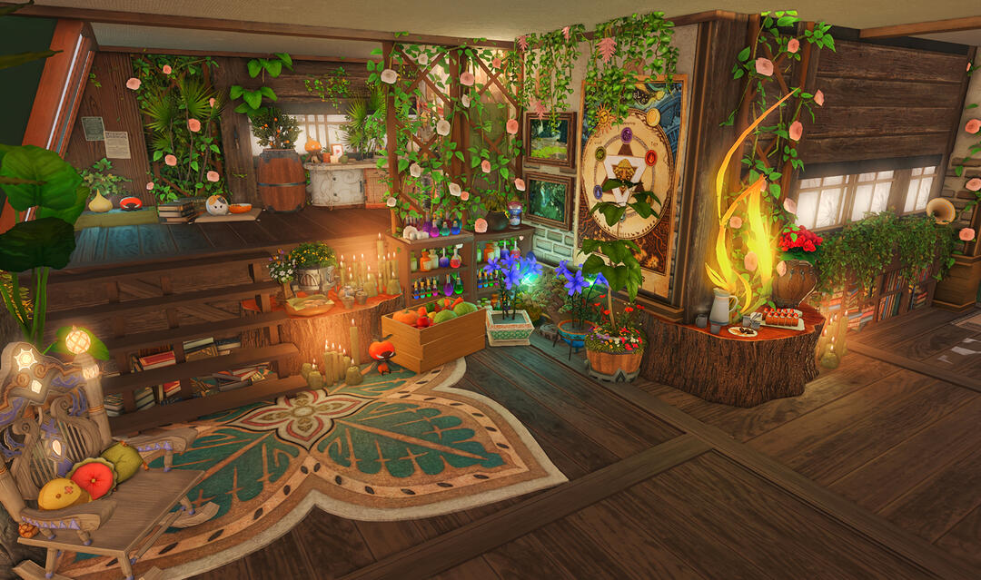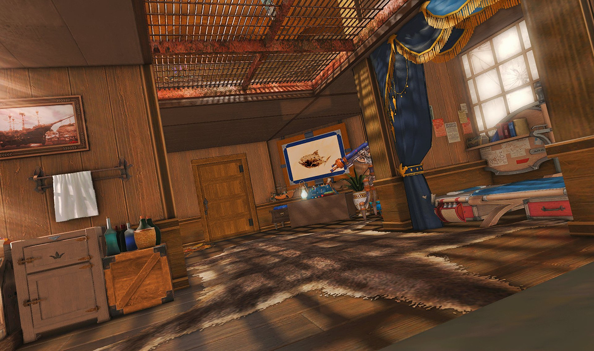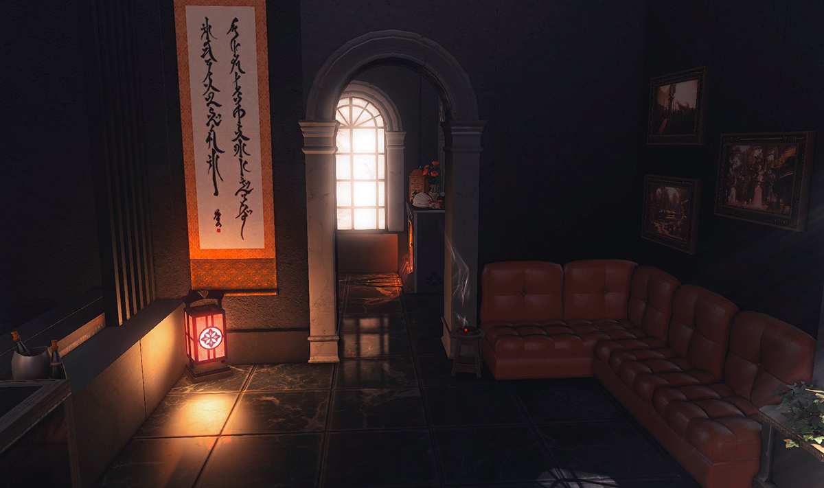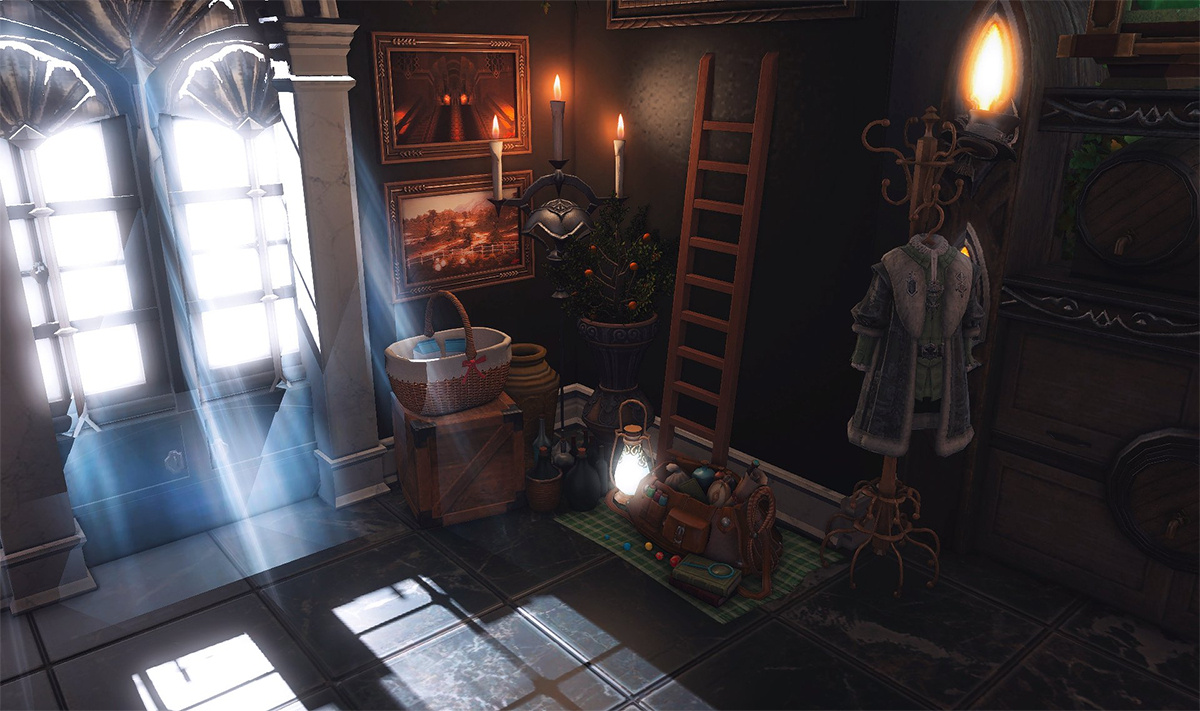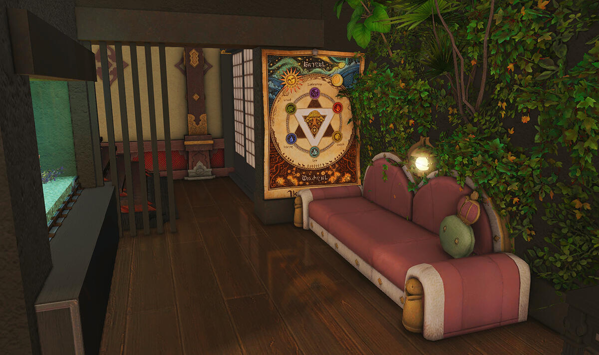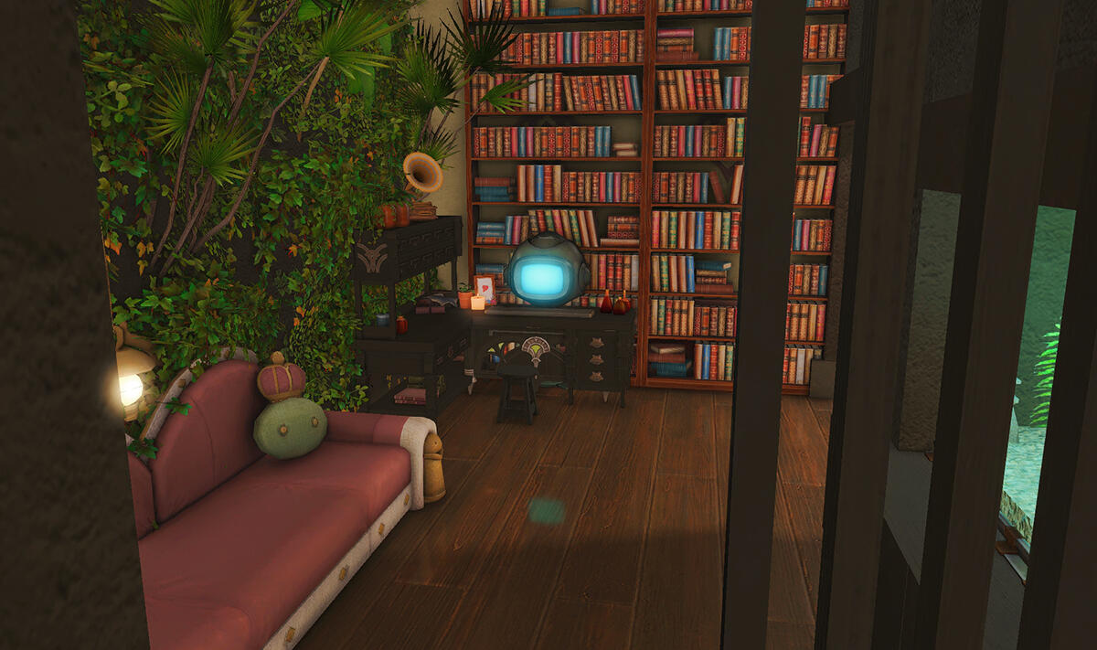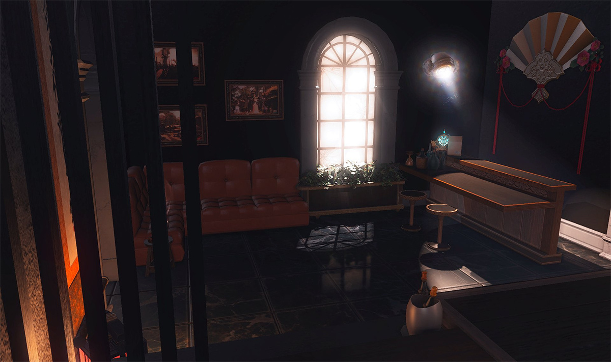 The locals tell of a mansion in the depths of The Black Shroud whose entryway glows with a soft and rustic light that invites you to spend some time with them, but opens to a large house with a dark, and strangely modern interior. Glowing portraits and magical game boxes, and a hidden balcony with a view of the night sky, one wonders who (or what) owns such a building.