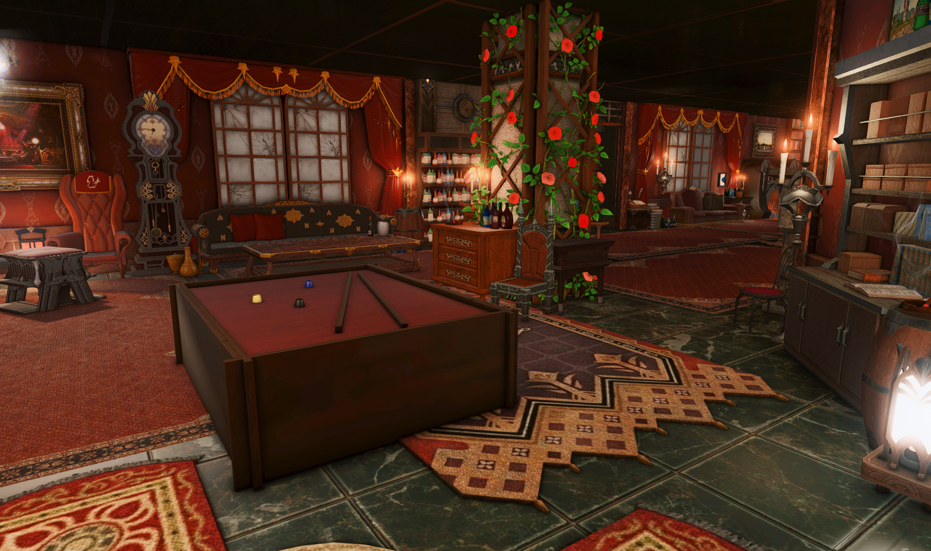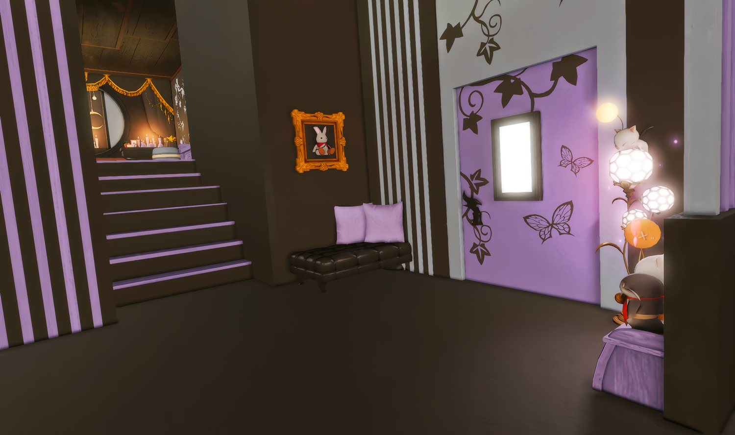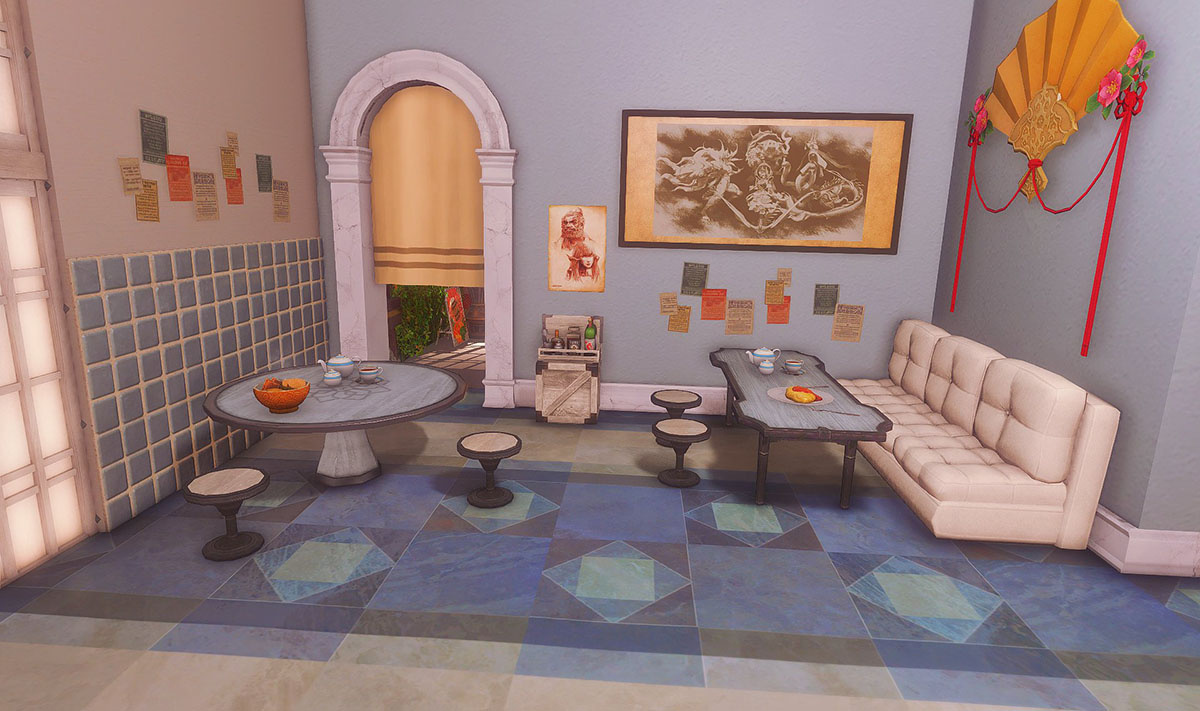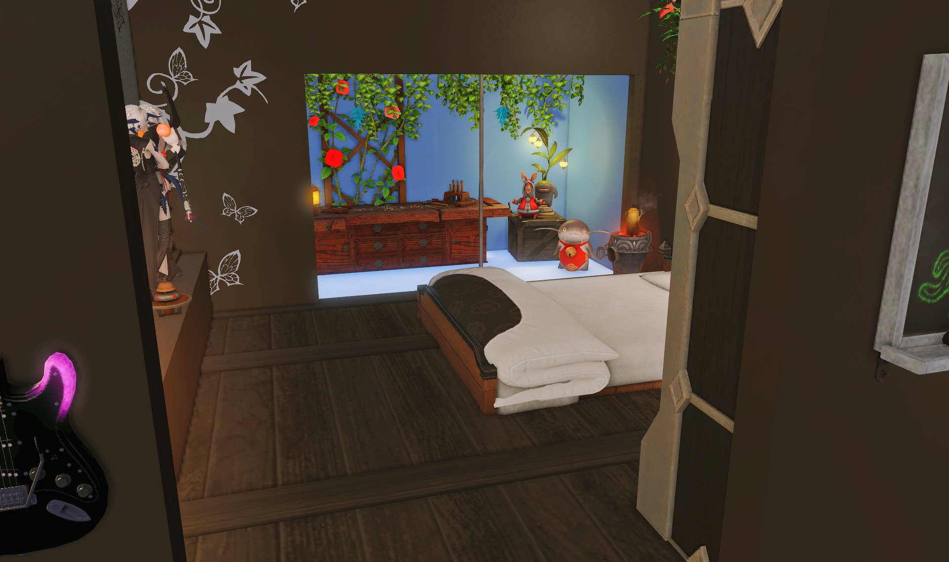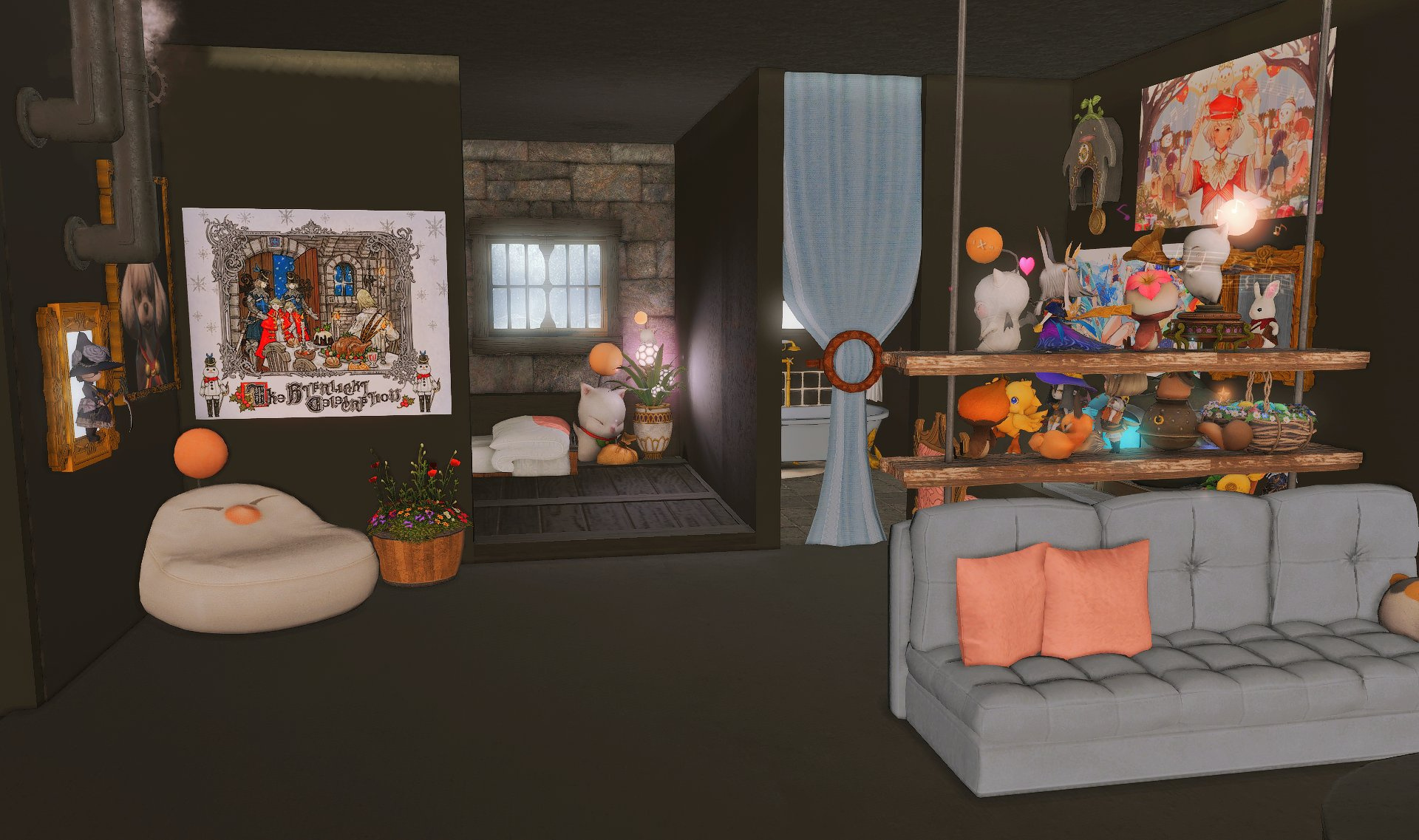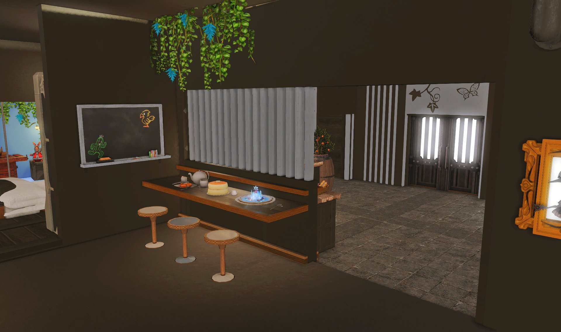 The locals tell of a mansion in the depths of The Black Shroud whose entryway glows with a soft and rustic light that invites you to spend some time with them, but opens to a large house with a dark, and strangely modern interior. Glowing portraits and magical game boxes, and a hidden balcony with a view of the night sky, one wonders who (or what) owns such a building.