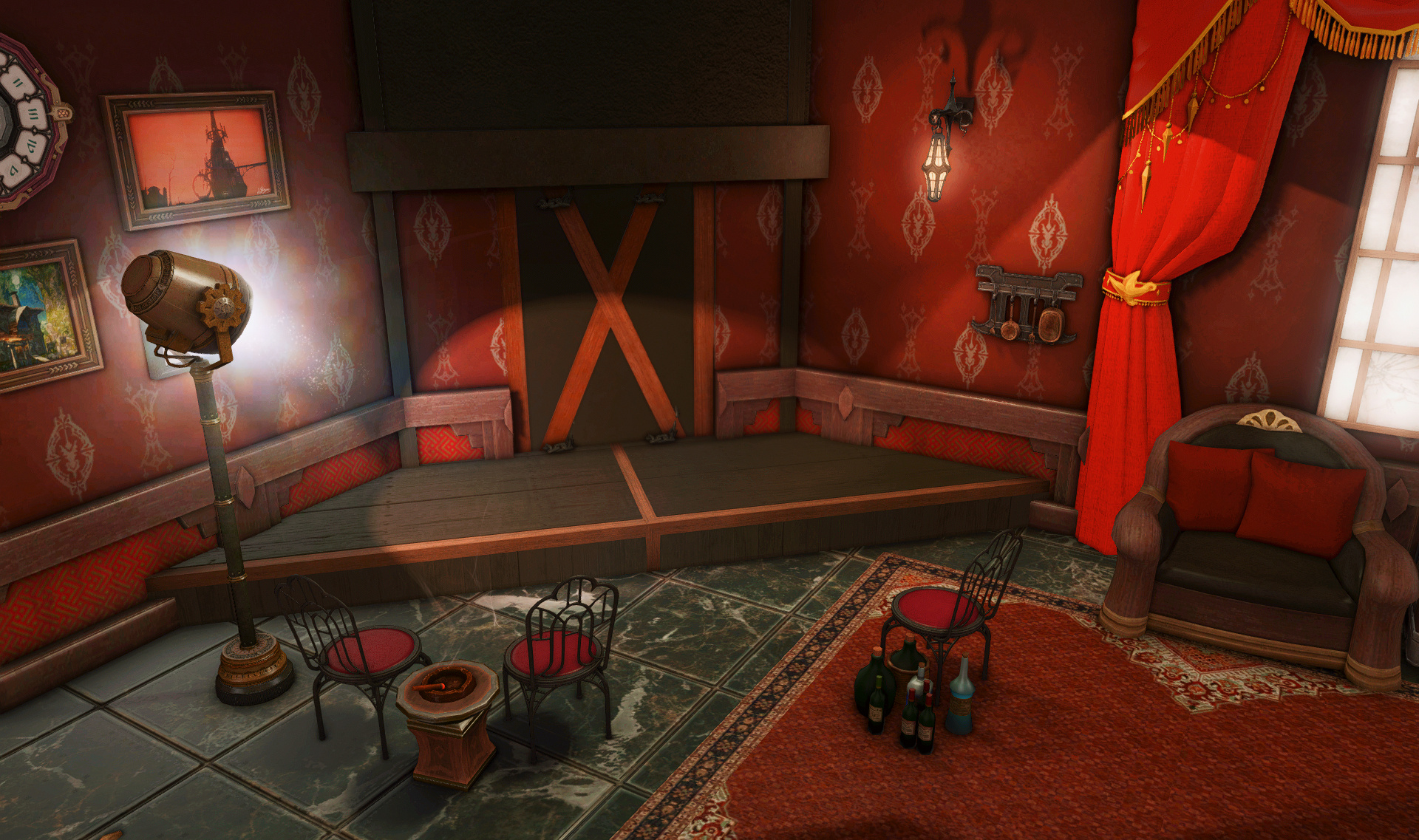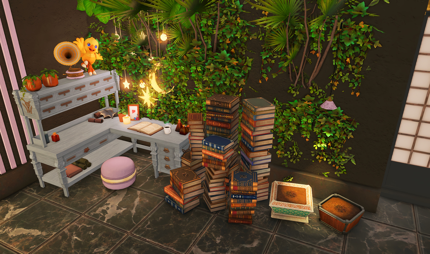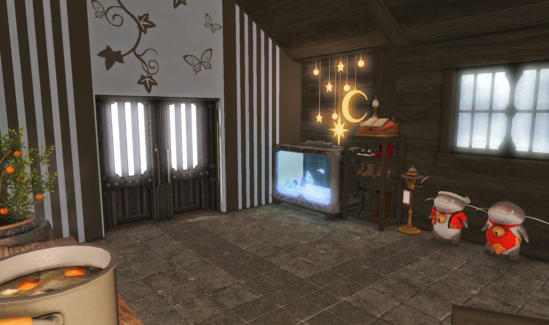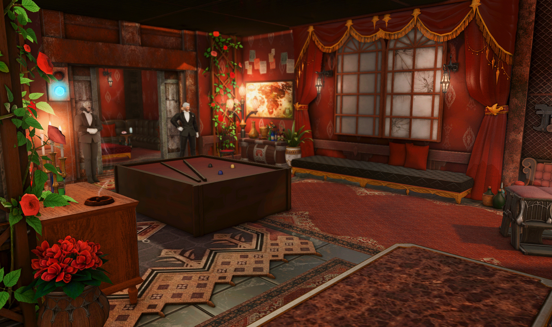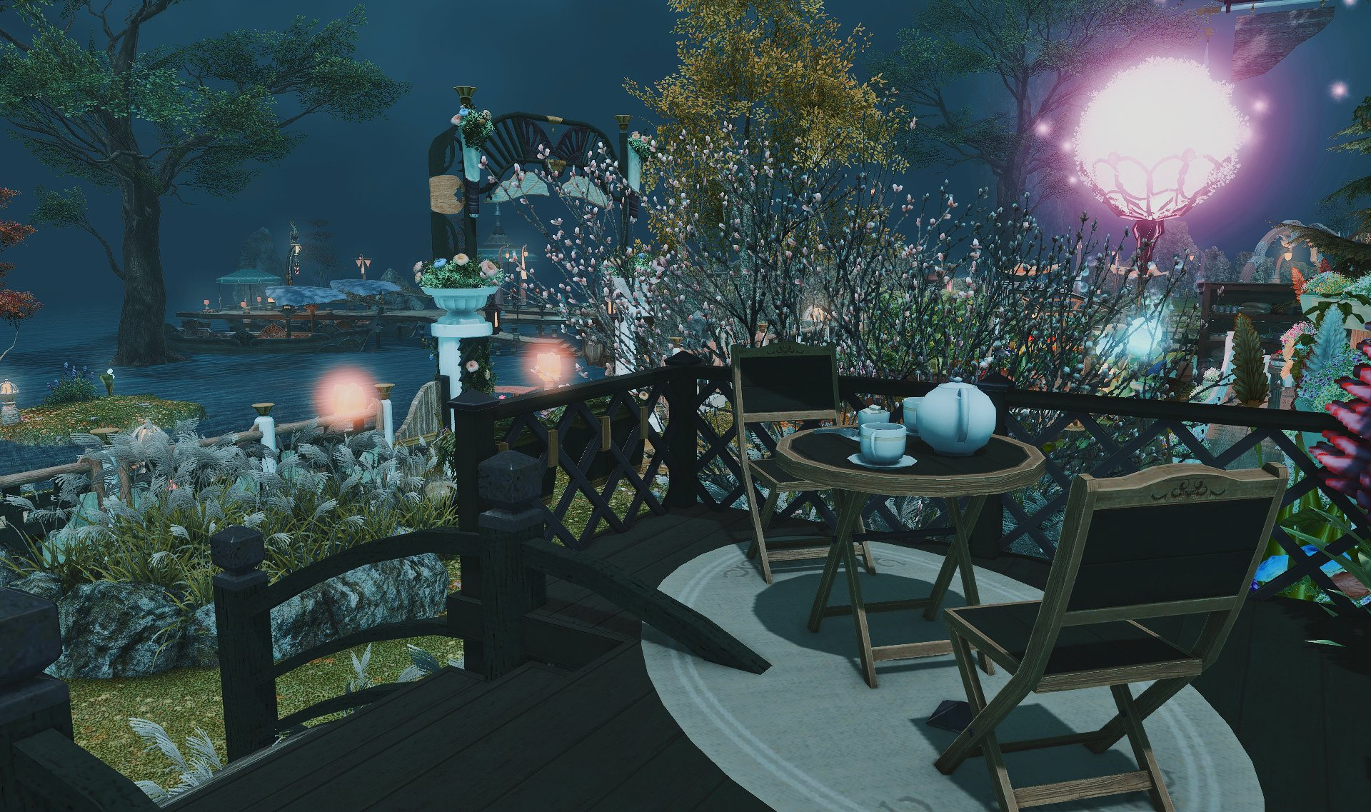 The locals tell of a mansion in the depths of The Black Shroud whose entryway glows with a soft and rustic light that invites you to spend some time with them, but opens to a large house with a dark, and strangely modern interior. Glowing portraits and magical game boxes, and a hidden balcony with a view of the night sky, one wonders who (or what) owns such a building.